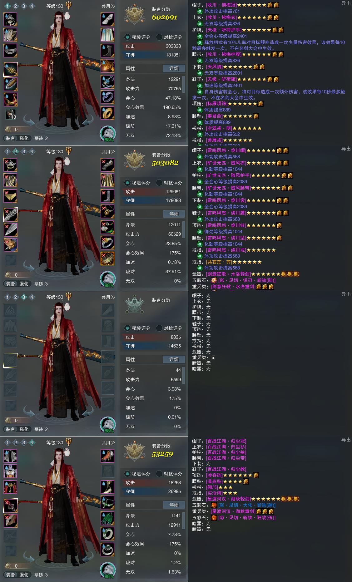 【装备】130级,山居剑意/问水诀PVE602691,山居剑意/问水诀PVP503082,装备三0,装备四53259