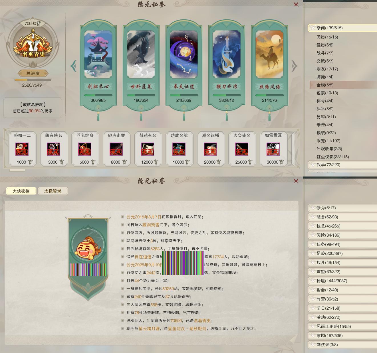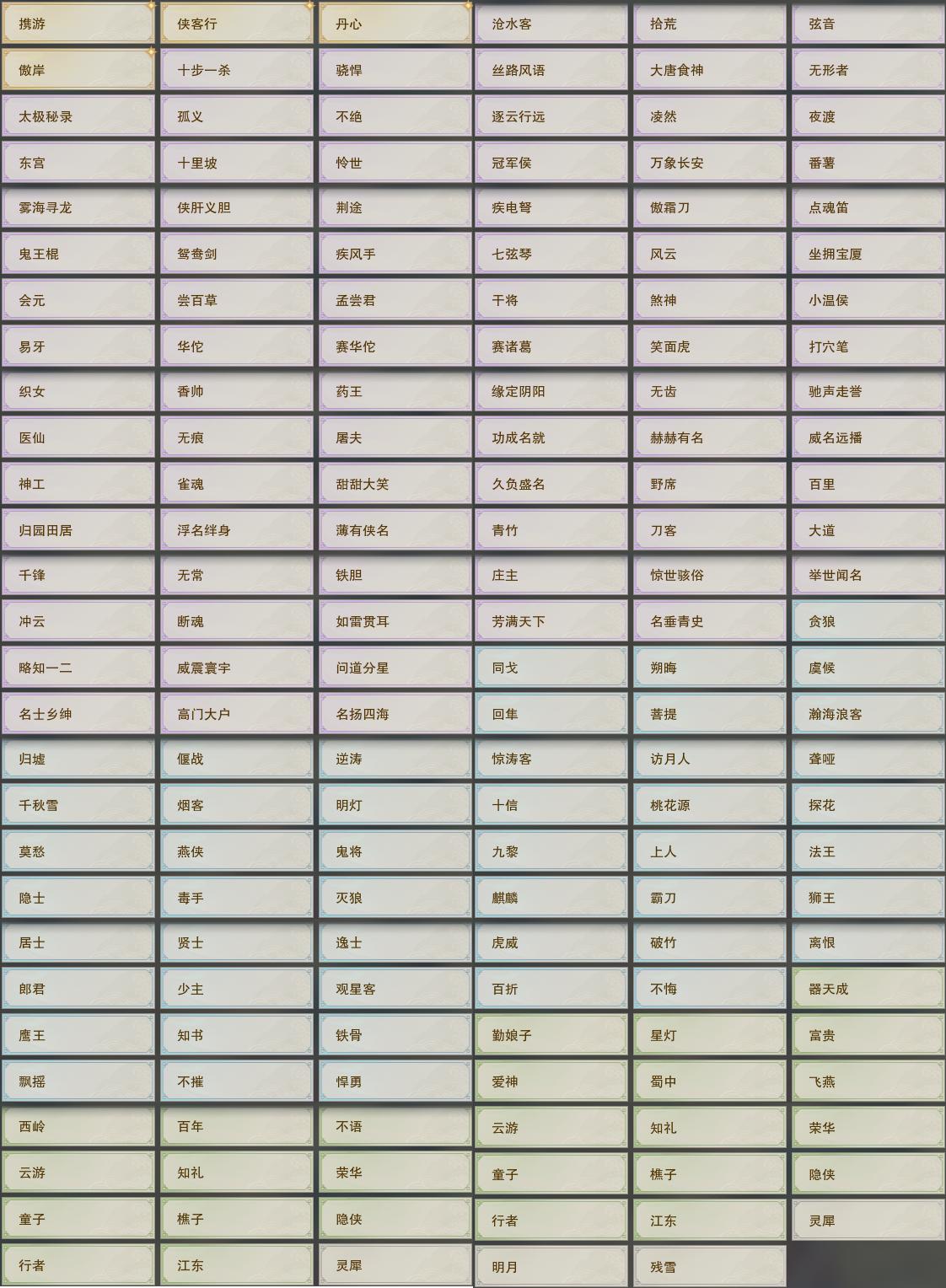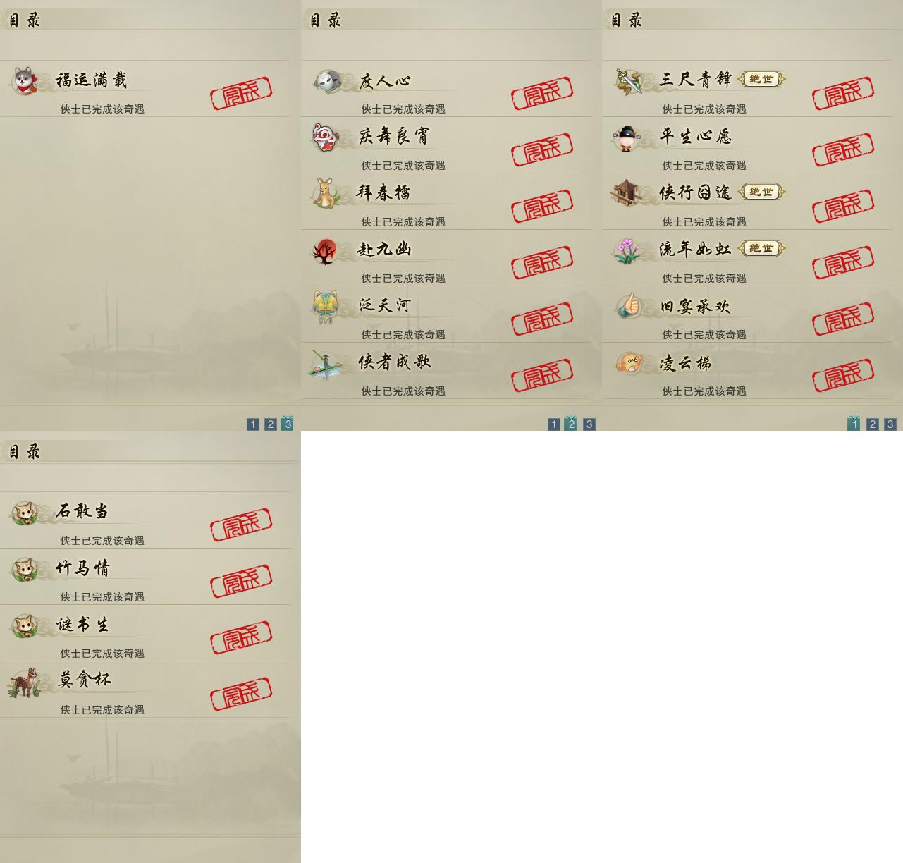 【奇遇】13个[平生心愿, 三尺青锋, 流年如虹, 侠行囧途, 庆舞良宵, 凌云梯, 度人心, 赴九幽, 旧宴承欢, 泛天河, 侠者成歌, 拜春擂, 福运满载]