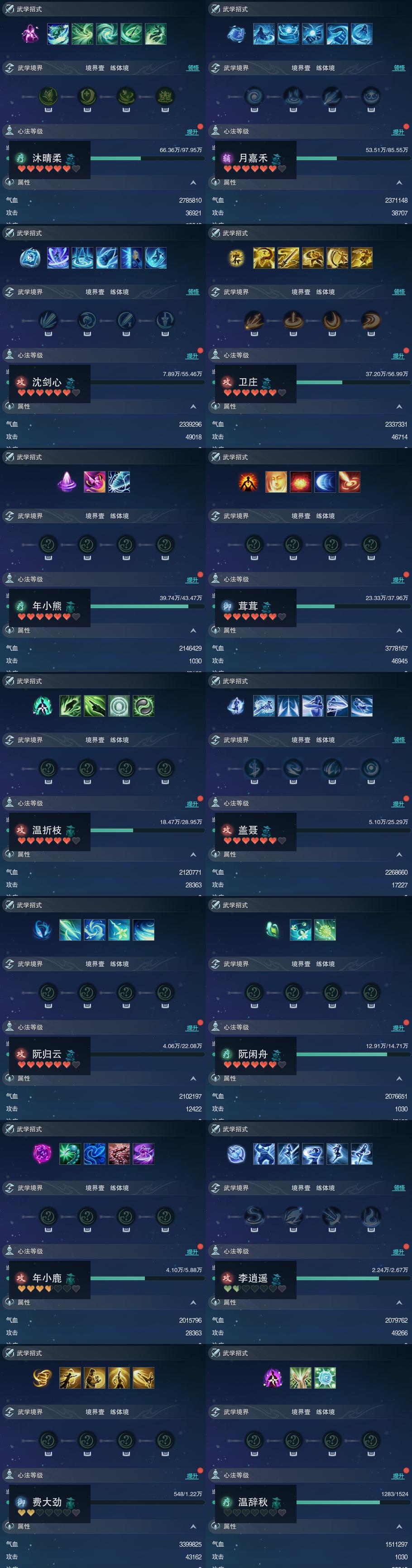 【同伴】沐晴柔84级境界壹,月嘉禾83级境界壹,沈剑心81级境界壹,卫庄意80级境界壹,年小熊78级境界壹,茸茸77级境界壹,温折枝75级境界壹,盖聂74级境界壹,阮归云73级境界壹,阮闲舟70级境界壹,年小鹿63级境界壹,李逍遥57级境界壹,费大劲51级境界壹,温辞秋3级境界壹