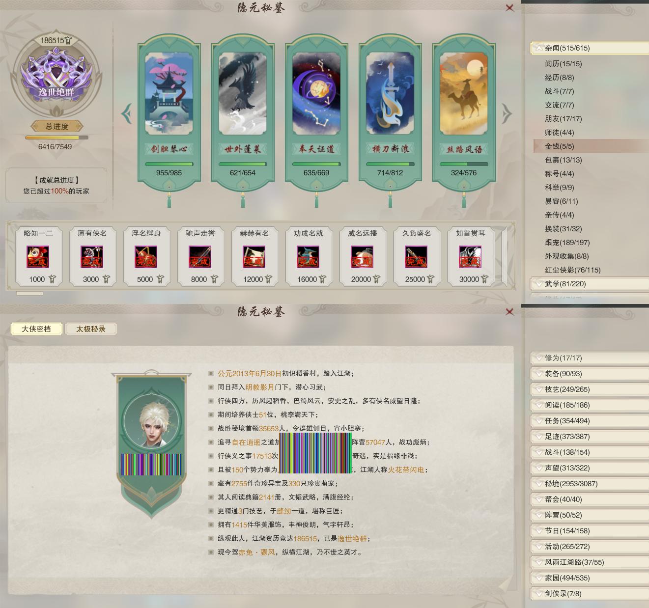 【奇遇】51个[白日梦, 天涯无归, 三山四海, 劝学记, 雪山恩仇, 阴阳两界, 莫负初心, 兔江湖, 平生心愿, 黑白路, 惜往日, 乱世舞姬, 塞外宝驹, 争铸吴钩, 韶华故, 虎啸山林, 济苍生, 护佑苍生, 少年行, 故园风雨, 扶摇九天, 三尺青锋, 流年如虹, 舞众生, 清风捕王, 侠行囧途, 寻猫记, 茶馆奇缘, 入蛟宫, 庆舞良宵]