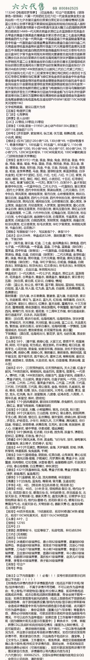 【如角色内详情内容多于详情截图内容(包括且不限于外观/背包/挂件等内容),不属于详情不符范畴,不可以此作为退单理由;号上背包/不绑定物品/通宝/积分默认清理,拓印件数包括成就成衣件数,成衣总数包括限时限量数量,帮会坐骑不随号一起出;如果在意狐狸毛披风的颜色(包括上部颜色和下部颜色和饰品颜色等,由于游戏画质设置/游戏内光线/显示器分辨率影响,会造成详情截图中外观与部件的颜色显示色差问题,此问题不可作为退单理由)、身份证信息(重置/过户/双非等)等重要内容,请务必仔细询问客服,付款后即表示悉知并接受当前账号内情况,不可以此作为退单理由!如果在意【工作服等不想要的外观(因为删除外观无法显示在截图中)】剩余点卡、分离、转服、阵营CD以及战阶和竞技场段位情况(截图为上架时情况,之后可能变动),请详细询问客服,如不询问,一切以账号当前情况为准,并且表示接受此号目前详情内情况,如在付款后发现有详情不符,需买家自行负责;只出角色不包括积分、通宝等。】