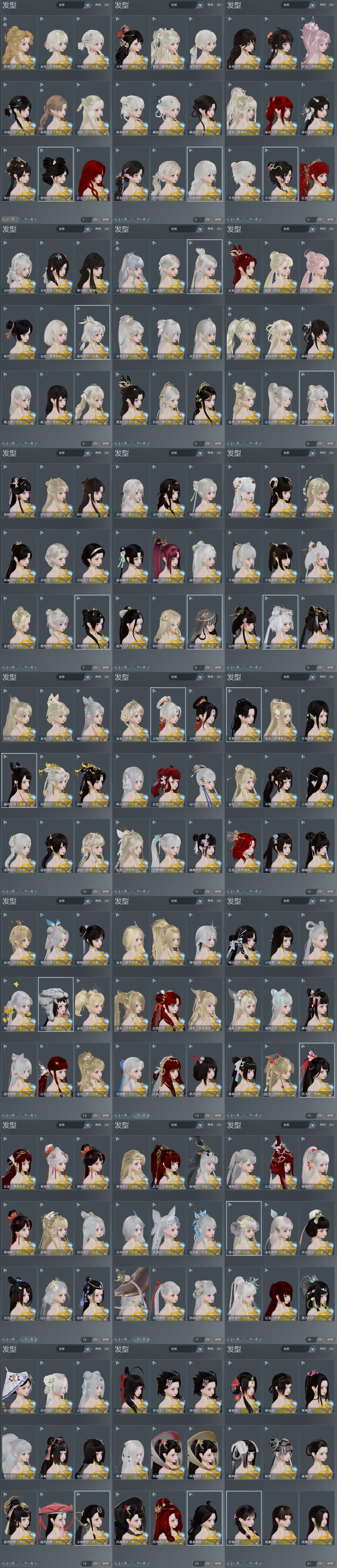 【发型】金发33个[一代金, 狐金, 猴金, 兔金, 资历金, 鼠金, 中秋金, 鸡金, 蝶金, 喵金, 考金, 国金, 苏金, 倒闭金, 狗金, 龙女金, 猪金, 珊瑚金, 飒金, 如归金, 凤金, 牛金, 云金, 凤仙金, 女仆金, 蔷薇金, 蛇金, 金发奉清茗, 马金, 狸金, 澄琼枝金发, 新蓝游园金, 白浮光金发], 红发19个[四红, 五红, 六红, 七红, 八红, 十二红, 紫发, 凤仙粉, 蝶粉, 羊红, 猴红, 鸡红, 狗红, 小资历红, 十五红, 红寻香红发, 马红, 雪漠飞绫红发, 一代灰], 黑发73个, 白发59个, 盒子发型[新绿中秋白发, 一代蓝中秋白, 二代七夕白, 一代重阳白, 踏云黑发, 四代七夕黑发, 四代中秋粉黑发, 黑谪仙黑发, 二代元宵白, 三代中秋白, 乘风黑发, 晴岚绘黑发, 雪月白发, 山吹樱雪黑发, 棉袄白, 踏云白发, 澡盒黑发, 四代七夕白发, 四代中秋粉白发, 绿中秋黑发, 黑谪仙白发, 乘风白发, 晴岚绘白发, 山吹樱雪白发, 墨心黑发, 净尘黑发, 澡盒白发, 月轻语黑发, 入梦黑发, 澄琼枝黑发, 墨心白发, 净尘白发, 唐风玉壶黑发, 月轻语白发, 唐风玉壶白发, 黑红尘白发, 新蓝游园黑, 十二黑, 六代中秋白发, 红梅盒白发, 花滑白发, 粉忘川白发, 七中白盒白发, 幽涧愀兮白发, 白鹭黑发, 书盒黑发, 白蛇盒黑发, 白蛇盒白发, 白陇西黑发, 发财黑发, 傀儡黑发, 傀儡白发, 粉浮光黑发, 红云香黑发, 粉毛衣黑发, 华灯夕雪黑发, 朱明摇光黑发, 书盒白发], 总页数21