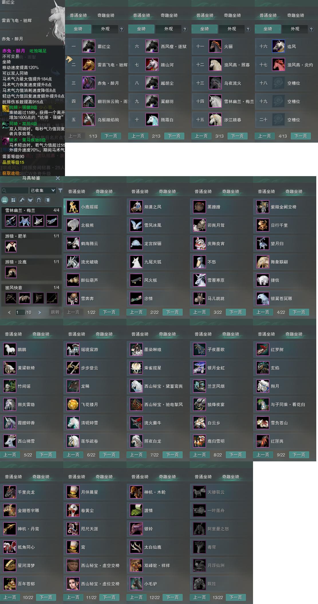【坐骑】17个[西风瘦逐狱, 翻羽抹云驹雨掣, 赤兔醉月, 白川普马, 霸红尘, 雷首飞电驰辉, 乌鬃踏焰驹]