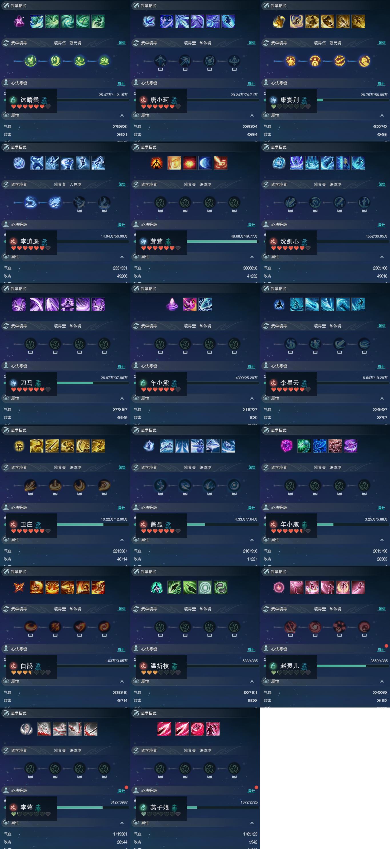 【同伴】沐晴柔85级境界伍,唐小珂82级境界壹,康宴别80级境界伍,李逍遥80级境界叁,茸茸志79级境界壹,沈剑心78级境界壹,刀马志77级境界壹,年小熊74级境界壹,李星云72级境界壹,卫庄意69级境界壹,盖聂65级境界壹,年小鹿63级境界壹,白鹊慈58级境界壹,温折枝41级境界壹,赵灵儿41级境界壹,李萼志40级境界壹,燕子娘36级境界壹
