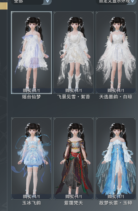 复刻:[白白菜, 锦衣行夜疾, 沧海间湘月, 沧海间琼台, 贺华岁霜降, 罗姆弦月, 天河清晏, 天河枕星, 雪山冰魄, 蓝二公主, 天选黄无色, 繁故幽, 夜斩白孤云, 夜斩白暮长, 沧海间跃鲤, 一梦飘摇, 五期福袋成衣, 粉仙侣, 复刻紫香凝, 折花留芳坠绯, 黄云霆]