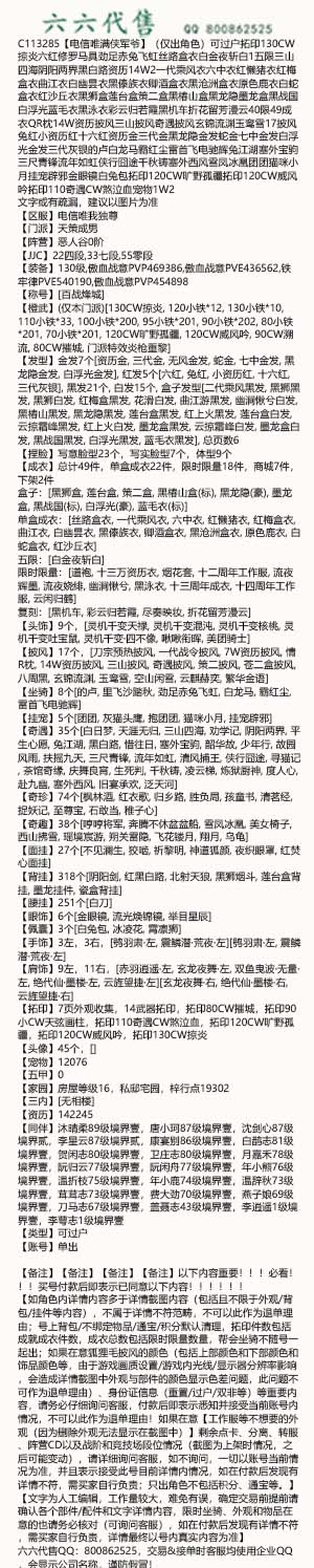 【如角色内详情内容多于详情截图内容(包括且不限于外观/背包/挂件等内容),不属于详情不符范畴,不可以此作为退单理由;号上背包/不绑定物品/通宝/积分默认清理,拓印件数包括成就成衣件数,成衣总数包括限时限量数量,帮会坐骑不随号一起出;如果在意狐狸毛披风的颜色(包括上部颜色和下部颜色和饰品颜色等,由于游戏画质设置/游戏内光线/显示器分辨率影响,会造成详情截图中外观与部件的颜色显示色差问题,此问题不可作为退单理由)、身份证信息(重置/过户/双非等)等重要内容,请务必仔细询问客服,付款后即表示悉知并接受当前账号内情况,不可以此作为退单理由!如果在意【工作服等不想要的外观(因为删除外观无法显示在截图中)】剩余点卡、分离、转服、阵营CD以及战阶和竞技场段位情况(截图为上架时情况,之后可能变动),请详细询问客服,如不询问,一切以账号当前情况为准,并且表示接受此号目前详情内情况,如在付款后发现有详情不符,需买家自行负责;只出角色不包括积分、通宝等。】