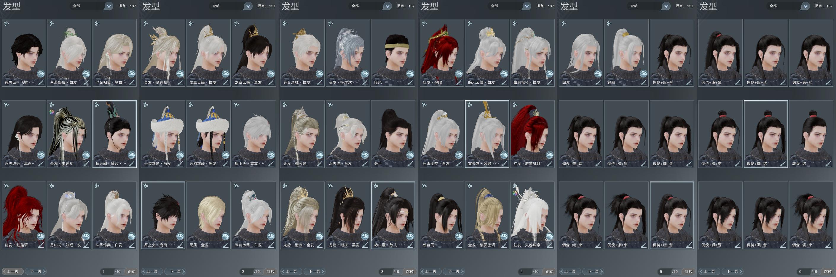 【发型】金发7个[资历金, 三代金, 无风金发, 蛇金, 七中金发, 黑龙隐金发, 白浮光金发], 红发5个[六红, 兔红, 小资历红, 十六红, 三代灰银], 黑发21个, 白发15个, 盒子发型[二代乘风黑发, 黑狮黑发, 黑狮白发, 红梅盒黑发, 花滑白发, 曲江游黑发, 幽涧愀兮白发, 黑椿山黑发, 黑龙隐黑发, 莲台盒黑发, 红上火黑发, 莲台盒白发, 云掠霜峰黑发, 红上火白发, 墨龙盒黑发, 云掠霜峰白发, 墨龙盒白发, 黑战国黑发, 白浮光黑发, 蓝毛衣黑发], 总页数6
