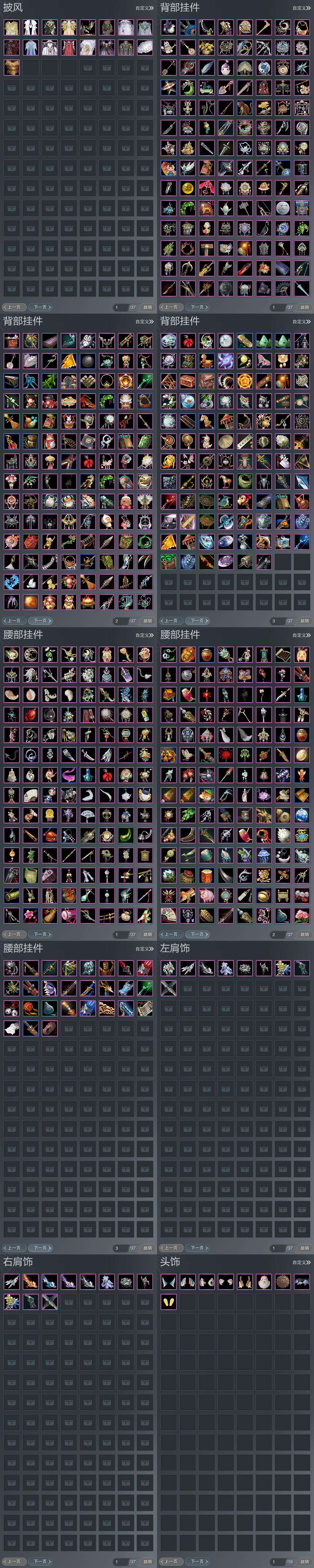 【披风】17个,[刀宗预热披风, 一代战令披风, 7W资历披风, 情R枕, 14W资历披风, 三山披风, 奇遇披风, 策二披风, 苍二盒披风, 八周黑, 玄锦流渊, 玉鸾雪, 空山闲雪, 云麒赫奕, 繁华金语]