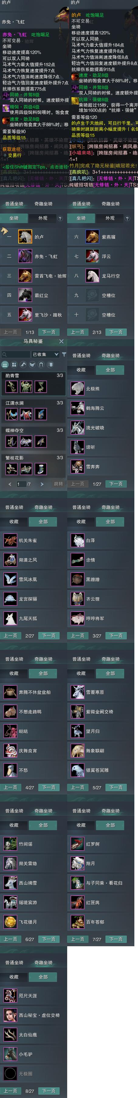 【坐骑】8个[的卢, 里飞沙踏秋, 劲足赤兔飞虹, 白龙马, 霸红尘, 雷首飞电驰辉]