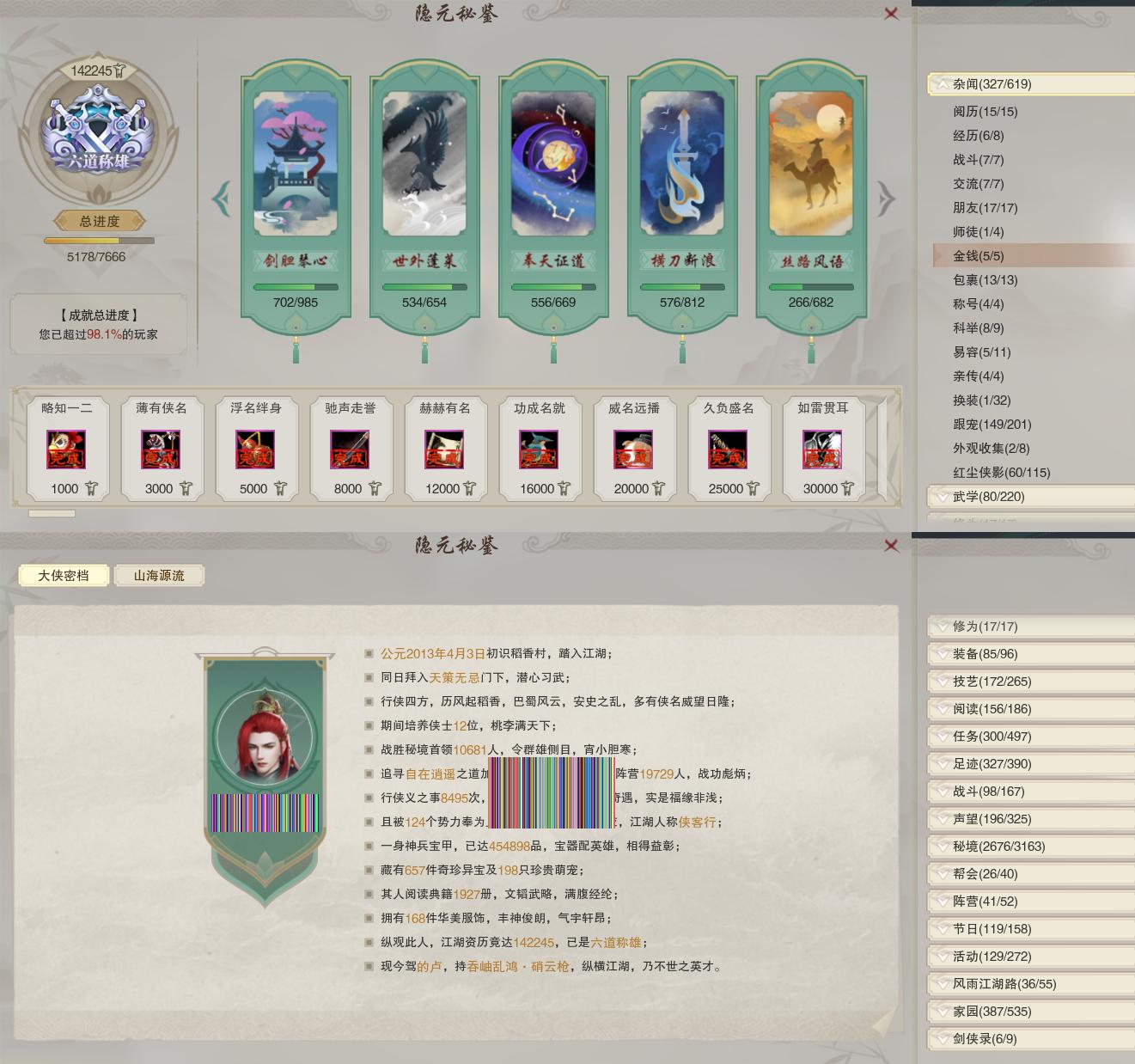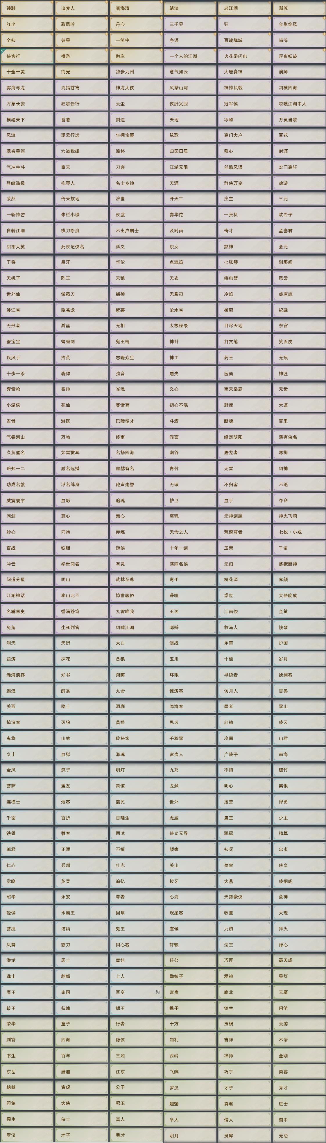 【奇遇】35个[白日梦, 天涯无归, 三山四海, 劝学记, 阴阳两界, 平生心愿, 兔江湖, 黑白路, 惜往日, 塞外宝驹, 韶华故, 少年行, 故园风雨, 扶摇九天, 三尺青锋, 流年如虹, 清风捕王, 侠行囧途, 寻猫记, 茶馆奇缘, 庆舞良宵, 生死判, 千秋铸, 凌云梯, 炼狱厨神, 度人心, 赴九幽, 塞外西风, 旧宴承欢, 泛天河]