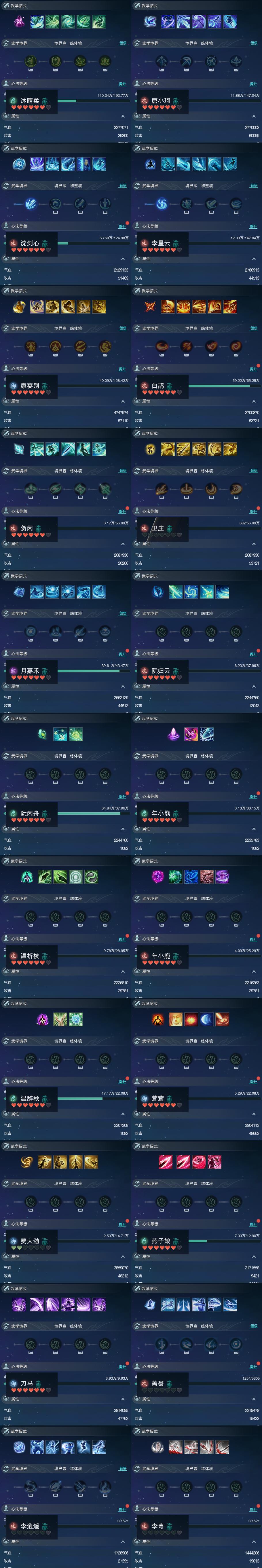 【同伴】沐晴柔89级境界壹,唐小珂87级境界壹,沈剑心87级境界贰,李星云87级境界贰,康宴别86级境界壹,白鹊志81级境界壹,贺闲志80级境界壹,卫庄志80级境界壹,月嘉禾78级境界壹,阮归云77级境界壹,阮闲舟77级境界壹,年小熊76级境界壹,温折枝75级境界壹,年小鹿74级境界壹,温辞秋73级境界壹,茸茸志73级境界壹,费大劲70级境界壹,燕子娘69级境界壹,刀马志67级境界壹,盖聂志43级境界壹,李逍遥1级境界壹,李萼志1级境界壹