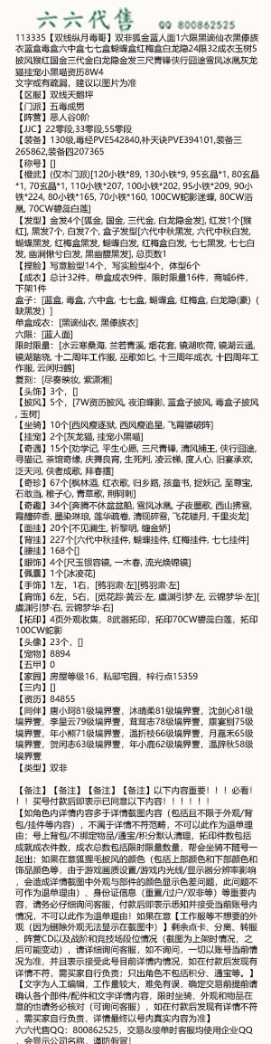 【如角色内详情内容多于详情截图内容(包括且不限于外观/背包/挂件等内容),不属于详情不符范畴,不可以此作为退单理由;号上背包/不绑定物品/通宝/积分默认清理,拓印件数包括成就成衣件数,成衣总数包括限时限量数量,帮会坐骑不随号一起出;如果在意狐狸毛披风的颜色(包括上部颜色和下部颜色和饰品颜色等,由于游戏画质设置/游戏内光线/显示器分辨率影响,会造成详情截图中外观与部件的颜色显示色差问题,此问题不可作为退单理由)、身份证信息(重置/过户/双非等)等重要内容,请务必仔细询问客服,付款后即表示悉知并接受当前账号内情况,不可以此作为退单理由!如果在意【工作服等不想要的外观(因为删除外观无法显示在截图中)】剩余点卡、分离、转服、阵营CD以及战阶和竞技场段位情况(截图为上架时情况,之后可能变动),请详细询问客服,如不询问,一切以账号当前情况为准,并且表示接受此号目前详情内情况,如在付款后发现有详情不符,需买家自行负责;只出角色不包括积分、通宝等。】