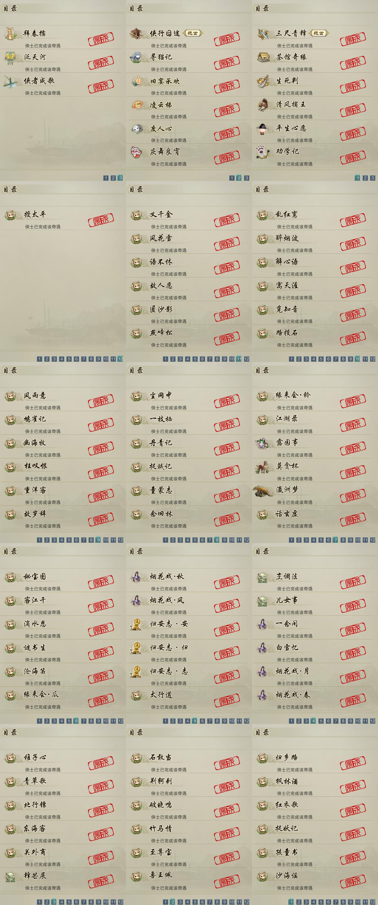 【奇遇】15个[劝学记, 平生心愿, 三尺青锋, 清风捕王, 侠行囧途, 寻猫记, 茶馆奇缘, 庆舞良宵, 生死判, 凌云梯, 度人心, 旧宴承欢, 泛天河, 侠者成歌, 拜春擂]