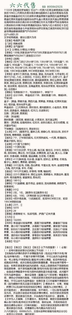 【如角色内详情内容多于详情截图内容(包括且不限于外观/背包/挂件等内容),不属于详情不符范畴,不可以此作为退单理由;号上背包/不绑定物品/通宝/积分默认清理,拓印件数包括成就成衣件数,成衣总数包括限时限量数量,帮会坐骑不随号一起出;如果在意狐狸毛披风的颜色(包括上部颜色和下部颜色和饰品颜色等,由于游戏画质设置/游戏内光线/显示器分辨率影响,会造成详情截图中外观与部件的颜色显示色差问题,此问题不可作为退单理由)、身份证信息(重置/过户/双非等)等重要内容,请务必仔细询问客服,付款后即表示悉知并接受当前账号内情况,不可以此作为退单理由!如果在意【工作服等不想要的外观(因为删除外观无法显示在截图中)】剩余点卡、分离、转服、阵营CD以及战阶和竞技场段位情况(截图为上架时情况,之后可能变动),请详细询问客服,如不询问,一切以账号当前情况为准,并且表示接受此号目前详情内情况,如在付款后发现有详情不符,需买家自行负责;只出角色不包括积分、通宝等。】