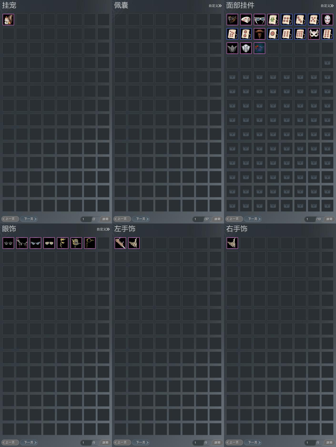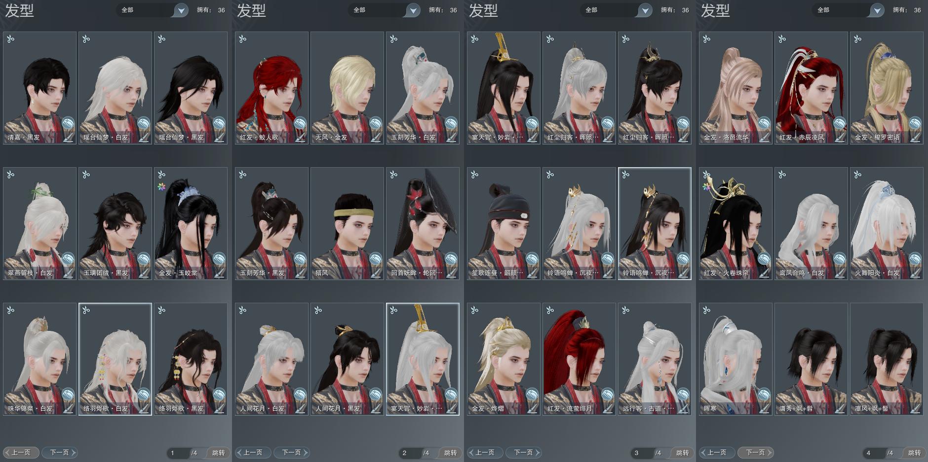 【发型】金发5个[资历金, 玫瑰金, 猪金, 无风金发, 七中金发], 红发4个[六红, 八红, 小资历红, 十五红], 黑发13个, 白发12个, 盒子发型[黑楼兰黑发, 黑楼兰白发, 唐风韶颜黑发, 黑红尘黑发, 黑狮黑发, 黑红尘白发, 黑狮白发, 芙蓉黑发, 芙蓉白发, 红黑妖眸盒黑发, 络羽黑发, 络羽白发, 玉璃盒黑发, 瑶台仙梦黑发, 瑶台仙梦白发], 总页数4