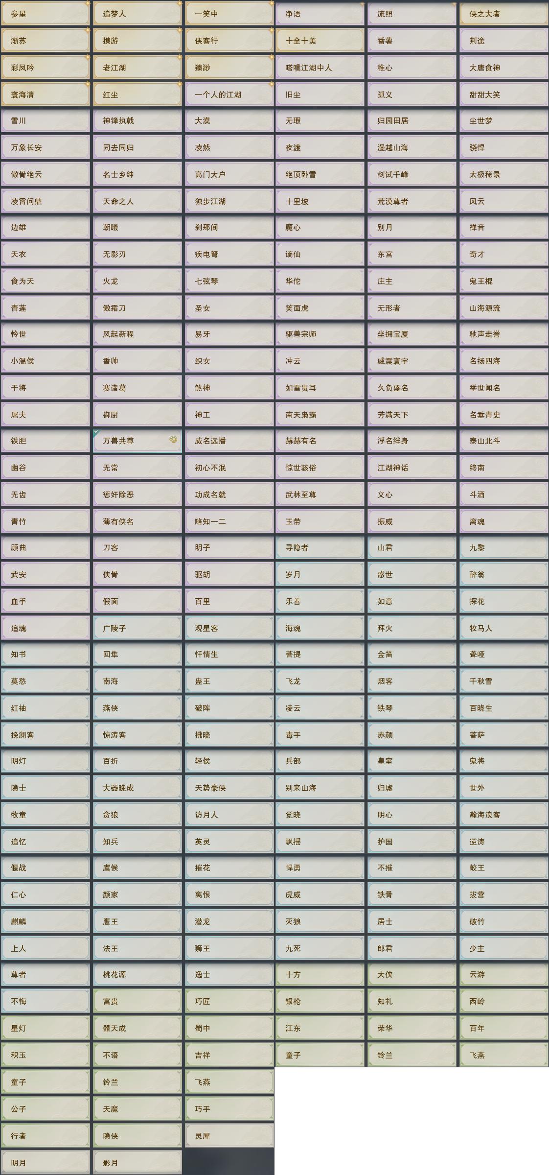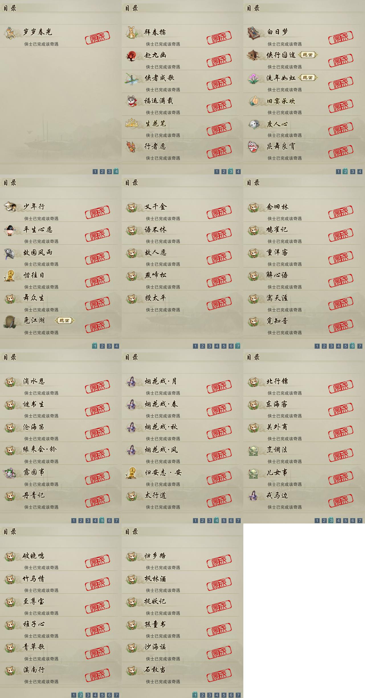 【奇遇】18个[白日梦, 平生心愿, 兔江湖, 惜往日, 少年行, 故园风雨, 流年如虹, 舞众生, 侠行囧途, 庆舞良宵, 赴九幽, 度人心, 旧宴承欢, 侠者成歌, 拜春擂, 福运满载, 生花笔, 行者愿]