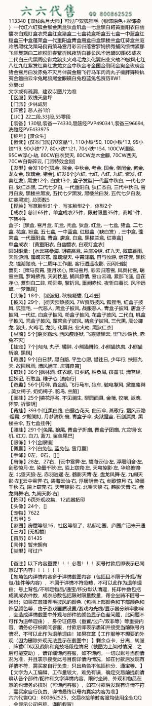 【如角色内详情内容多于详情截图内容(包括且不限于外观/背包/挂件等内容),不属于详情不符范畴,不可以此作为退单理由;号上背包/不绑定物品/通宝/积分默认清理,拓印件数包括成就成衣件数,成衣总数包括限时限量数量,帮会坐骑不随号一起出;如果在意狐狸毛披风的颜色(包括上部颜色和下部颜色和饰品颜色等,由于游戏画质设置/游戏内光线/显示器分辨率影响,会造成详情截图中外观与部件的颜色显示色差问题,此问题不可作为退单理由)、身份证信息(重置/过户/双非等)等重要内容,请务必仔细询问客服,付款后即表示悉知并接受当前账号内情况,不可以此作为退单理由!如果在意【工作服等不想要的外观(因为删除外观无法显示在截图中)】剩余点卡、分离、转服、阵营CD以及战阶和竞技场段位情况(截图为上架时情况,之后可能变动),请详细询问客服,如不询问,一切以账号当前情况为准,并且表示接受此号目前详情内情况,如在付款后发现有详情不符,需买家自行负责;只出角色不包括积分、通宝等。】