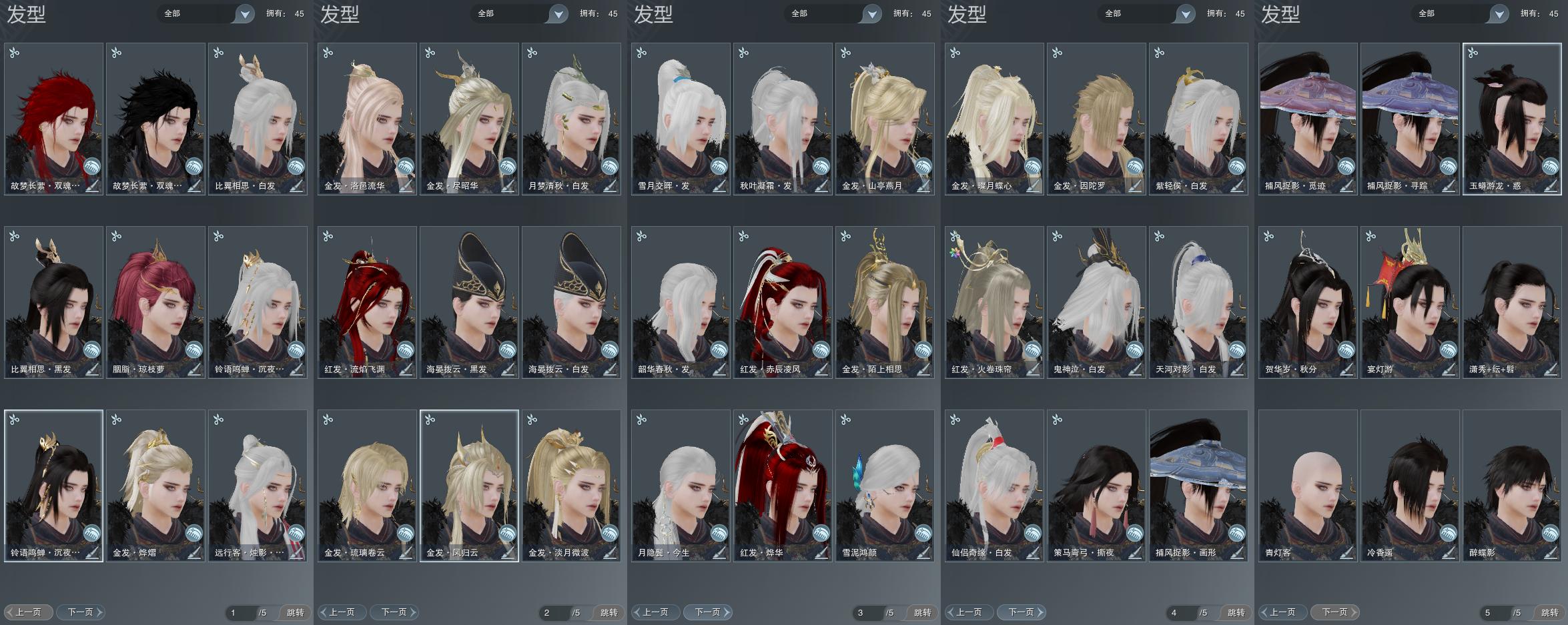 【发型】金发10个[狐金, 猴金, 中秋金, 考金, 国金, 倒闭金, 狗金, 龙女金, 玫瑰金, 猪金], 红发6个[六红, 七红, 八红, 九红, 紫发, 红葵红发], 黑发12个, 白发13个, 盒子发型[一代蓝中秋白, 一代七夕白, 狄仁杰黑, 二代七夕白, 一代重阳白, 狄仁杰白, 三代中秋白, 雪月白发, 黑楼兰黑发, 五代七夕黑发, 黑楼兰白发, 五代七夕白发, 红葵黑发], 总页数5