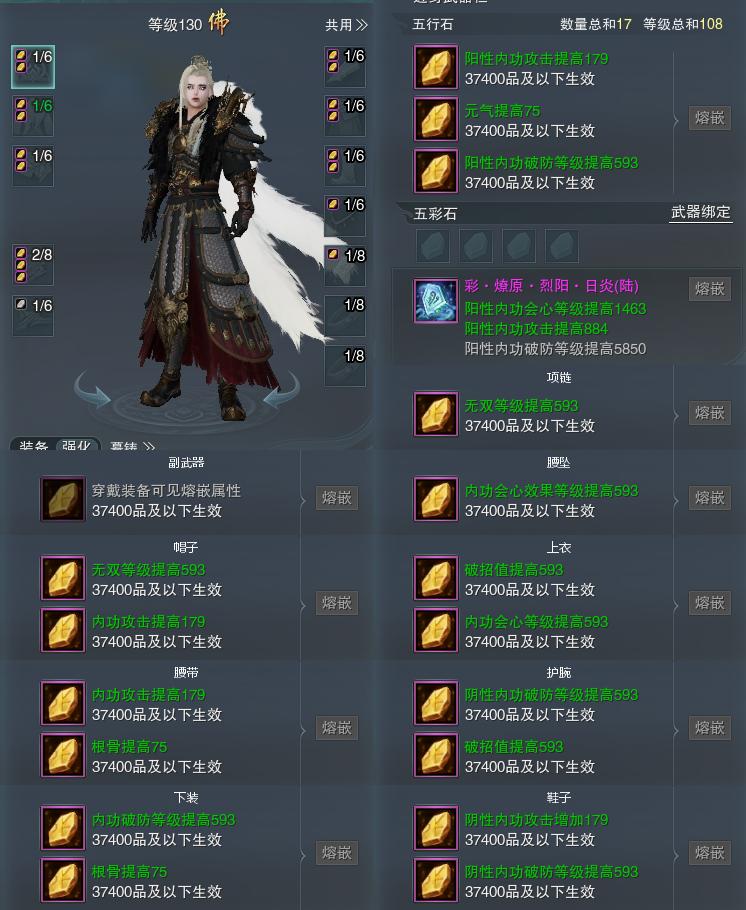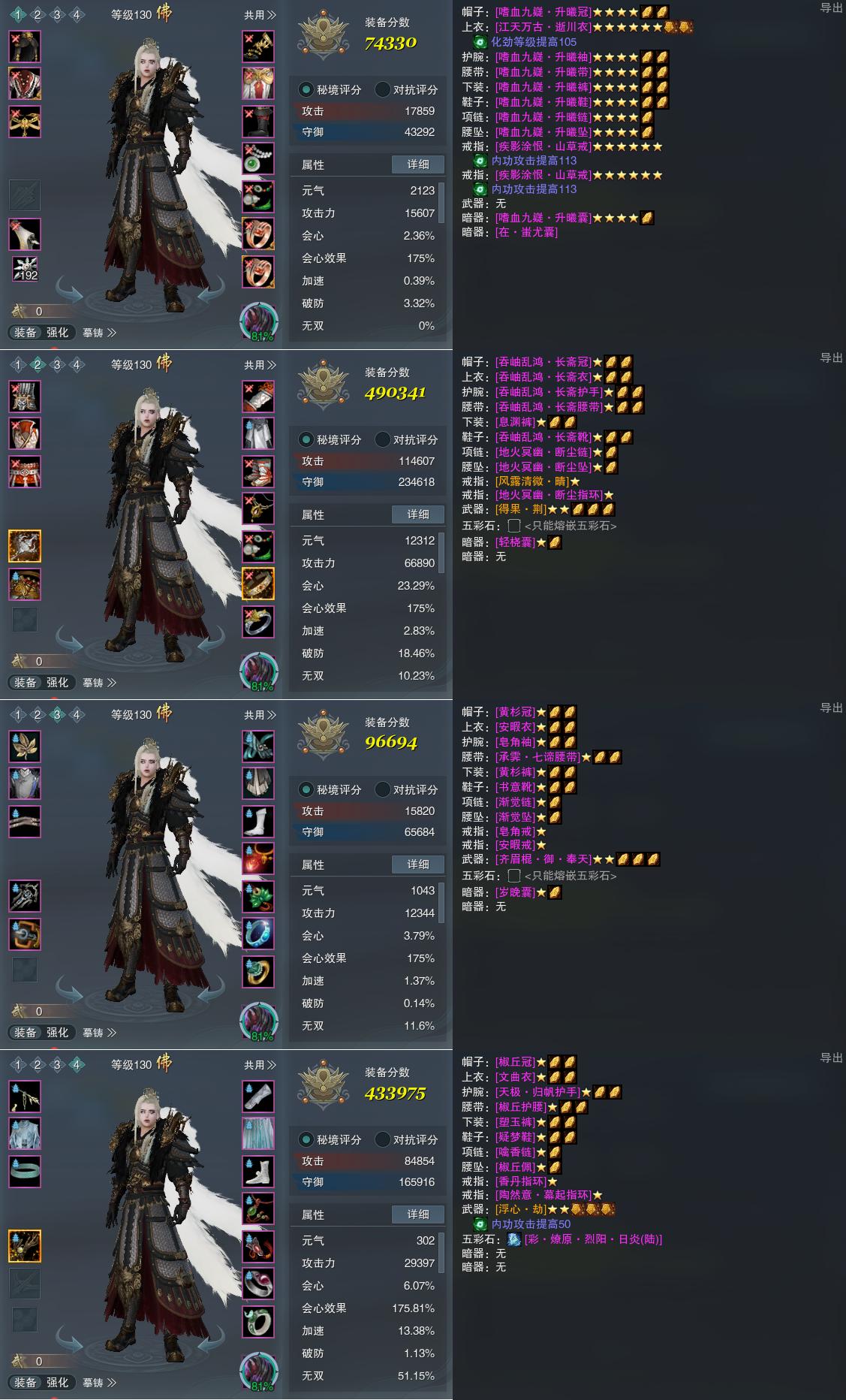 【装备】130级,装备一74330,易筋经PVP490341,装备三96694,洗髓经PVE433975
