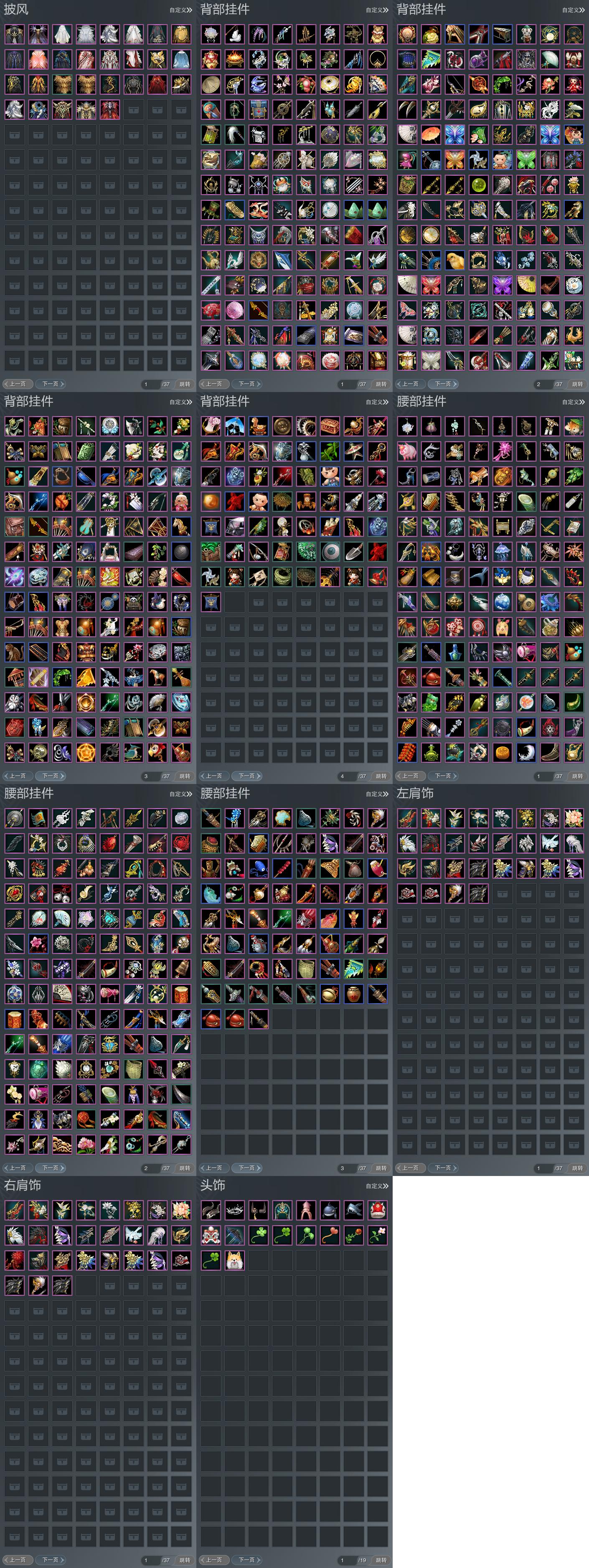 【肩饰】28左,27右,[云中雪霁·左, 碧海云仙·左, 浮屠明音·左, 剑歌惊月·左, 染墨千秋·左, 陌上窈窕·左, 天穹掠影·左, 华焰披锦·左, 北望天狼·左, 赤羽逍遥·左, 鹤影天青·左, 盘龙凤舞·左, 九阙天影·左][云中雪霁·右, 碧海云仙·右, 浮屠明音·右, 剑歌惊月·右, 染墨千秋·右, 陌上窈窕·右, 天穹掠影·右, 北望天狼·右, 鹤影天青·右, 盘龙凤舞·右, 九阙天影·右]