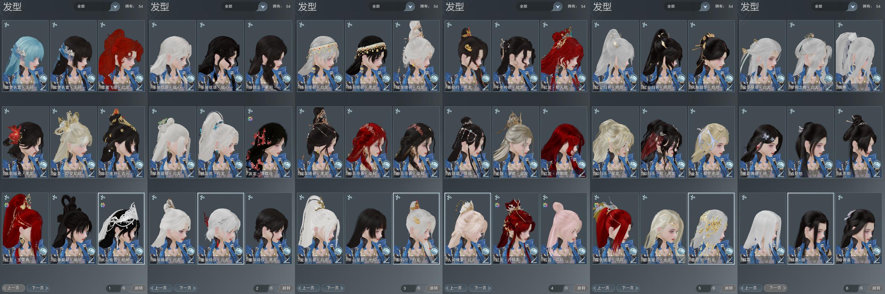 【发型】金发6个[资历金, 苏金, 如归金, 马金, 红人间金发, 黑龙隐金发], 红发9个[十四红, 蓝葵蓝发, 凤仙粉, 蝶粉, 虎红, 十五红, 红寻香红发, 马红, 雪漠飞绫红发], 黑发23个, 白发16个, 盒子发型[红如归黑发, 烨然黑发, 黑红尘黑发, 黑红尘白发, 红藏袍黑发, 白蛇盒黑发, 镰刀黑发, 红千山黑发, 白蛇盒白发, 镰刀白发, 红寻香黑发, 瑶华盒黑发, 墨龙盒白发, 瑶华盒白发, 络羽黑发, 络羽白发, 涉烟尘素羽黑发, 白波斯黑发, 红天山黑发, 红云香黑发, 白波期白发, 华灯吉元黑发, 朱明摇光黑发, 蓝葵黑发], 总页数6