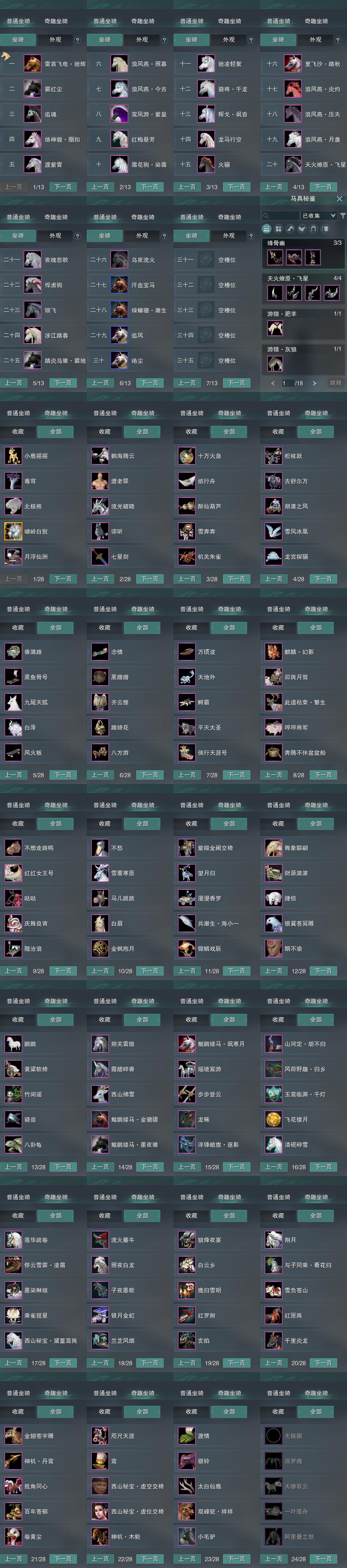 【坐骑】30个[绝尘, 踏炎霸地, 里飞沙踏秋, 红马, 雪马, 白龙马, 黑翅马, 天火燎原飞星, 霜花驹染霜, 络神骏胭扣, 挥戈飒沓, 鸾凤游紫皇, 浪风燕今古, 骁将千龙, 霸红尘, 雷首飞电驰辉]