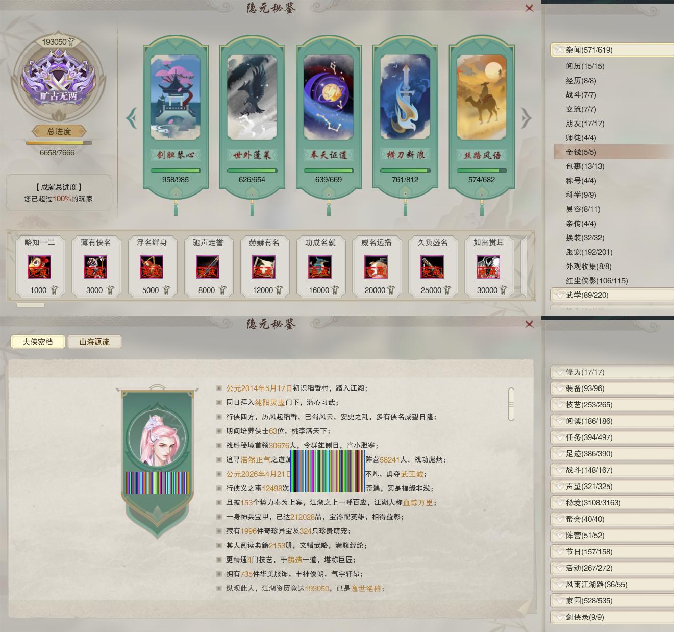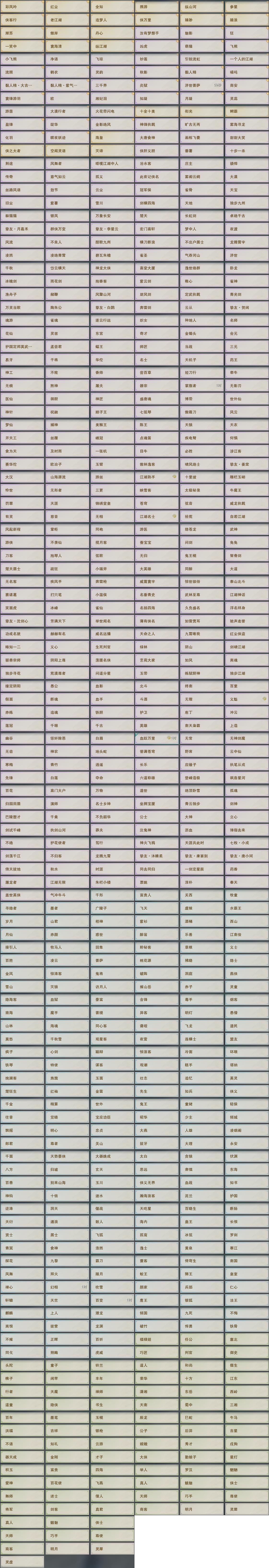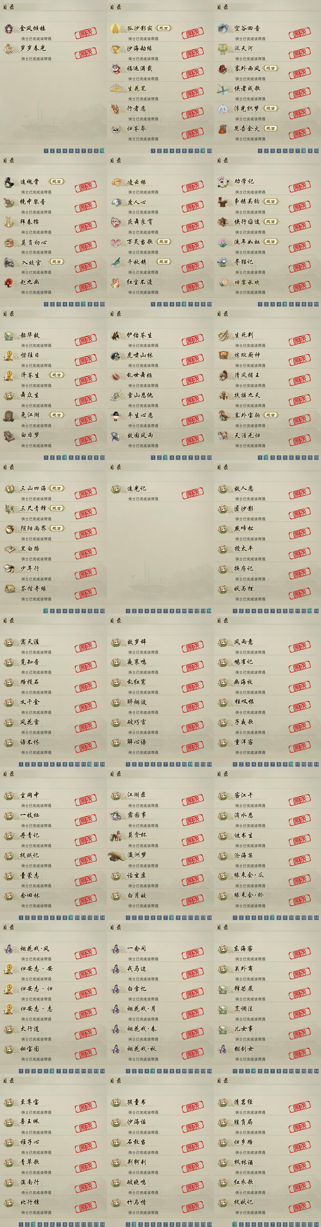 【奇遇】55个[白日梦, 天涯无归, 三山四海, 劝学记, 雪山恩仇, 阴阳两界, 莫负初心, 兔江湖, 平生心愿, 黑白路, 惜往日, 乱世舞姬, 塞外宝驹, 争铸吴钩, 韶华故, 虎啸山林, 济苍生, 护佑苍生, 少年行, 故园风雨, 扶摇九天, 三尺青锋, 流年如虹, 舞众生, 清风捕王, 侠行囧途, 寻猫记, 茶馆奇缘, 入蛟宫, 庆舞良宵]