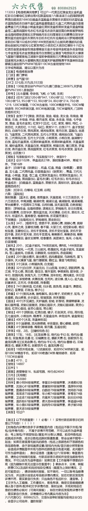 【如角色内详情内容多于详情截图内容(包括且不限于外观/背包/挂件等内容),不属于详情不符范畴,不可以此作为退单理由;号上背包/不绑定物品/通宝/积分默认清理,拓印件数包括成就成衣件数,成衣总数包括限时限量数量,帮会坐骑不随号一起出;如果在意狐狸毛披风的颜色(包括上部颜色和下部颜色和饰品颜色等,由于游戏画质设置/游戏内光线/显示器分辨率影响,会造成详情截图中外观与部件的颜色显示色差问题,此问题不可作为退单理由)、身份证信息(重置/过户/双非等)等重要内容,请务必仔细询问客服,付款后即表示悉知并接受当前账号内情况,不可以此作为退单理由!如果在意【工作服等不想要的外观(因为删除外观无法显示在截图中)】剩余点卡、分离、转服、阵营CD以及战阶和竞技场段位情况(截图为上架时情况,之后可能变动),请详细询问客服,如不询问,一切以账号当前情况为准,并且表示接受此号目前详情内情况,如在付款后发现有详情不符,需买家自行负责;只出角色不包括积分、通宝等。】