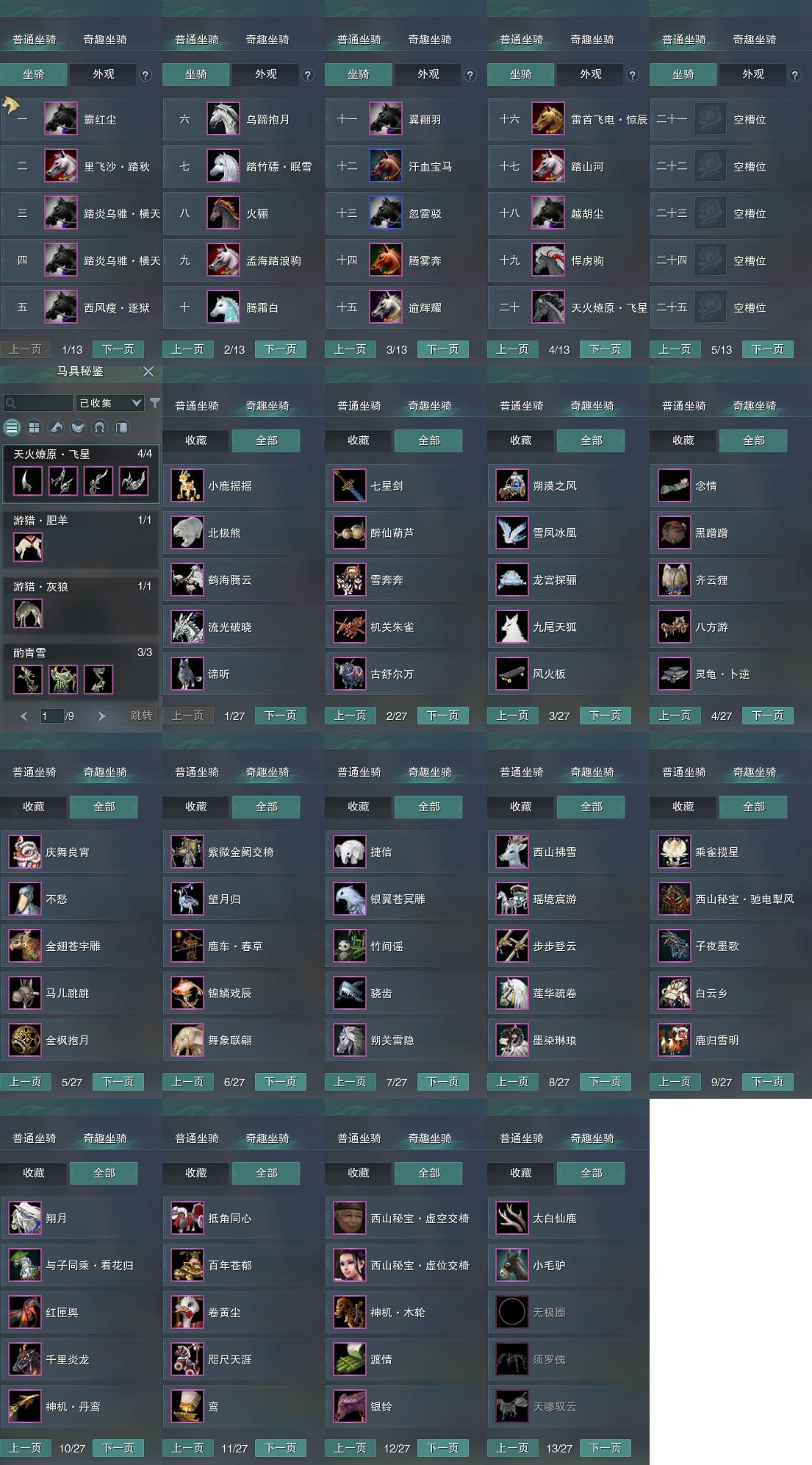 【坐骑】20个[踏炎横天, 踏炎横天, 西风瘦逐狱, 乌蹄抱月, 里飞沙踏秋, 天火燎原飞星, 踏竹骠眠雪, 霸红尘, 雷首飞电惊辰]
