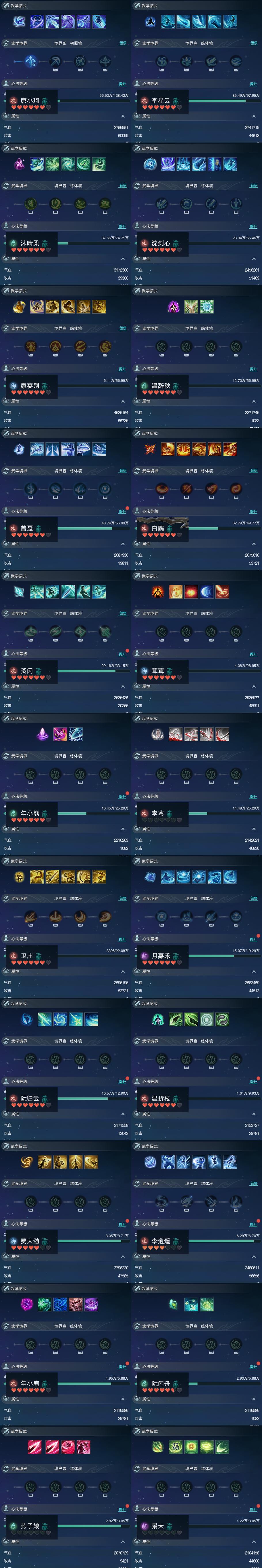 【同伴】唐小珂86级境界贰,李星云84级境界壹,沐晴柔82级境界壹,沈剑心81级境界壹,康宴别80级境界壹,温辞秋80级境界壹,盖聂志80级境界壹,白鹊志79级境界壹,贺闲志76级境界壹,茸茸志75级境界壹,年小熊74级境界壹,李萼志74级境界壹,卫庄志73级境界壹,月嘉禾72级境界壹,阮归云69级境界壹,温折枝67级境界壹,费大劲66级境界壹,李逍遥64级境界壹,年小鹿63级境界壹,阮闲舟63级境界壹,燕子娘58级境界壹,景天志58级境界壹