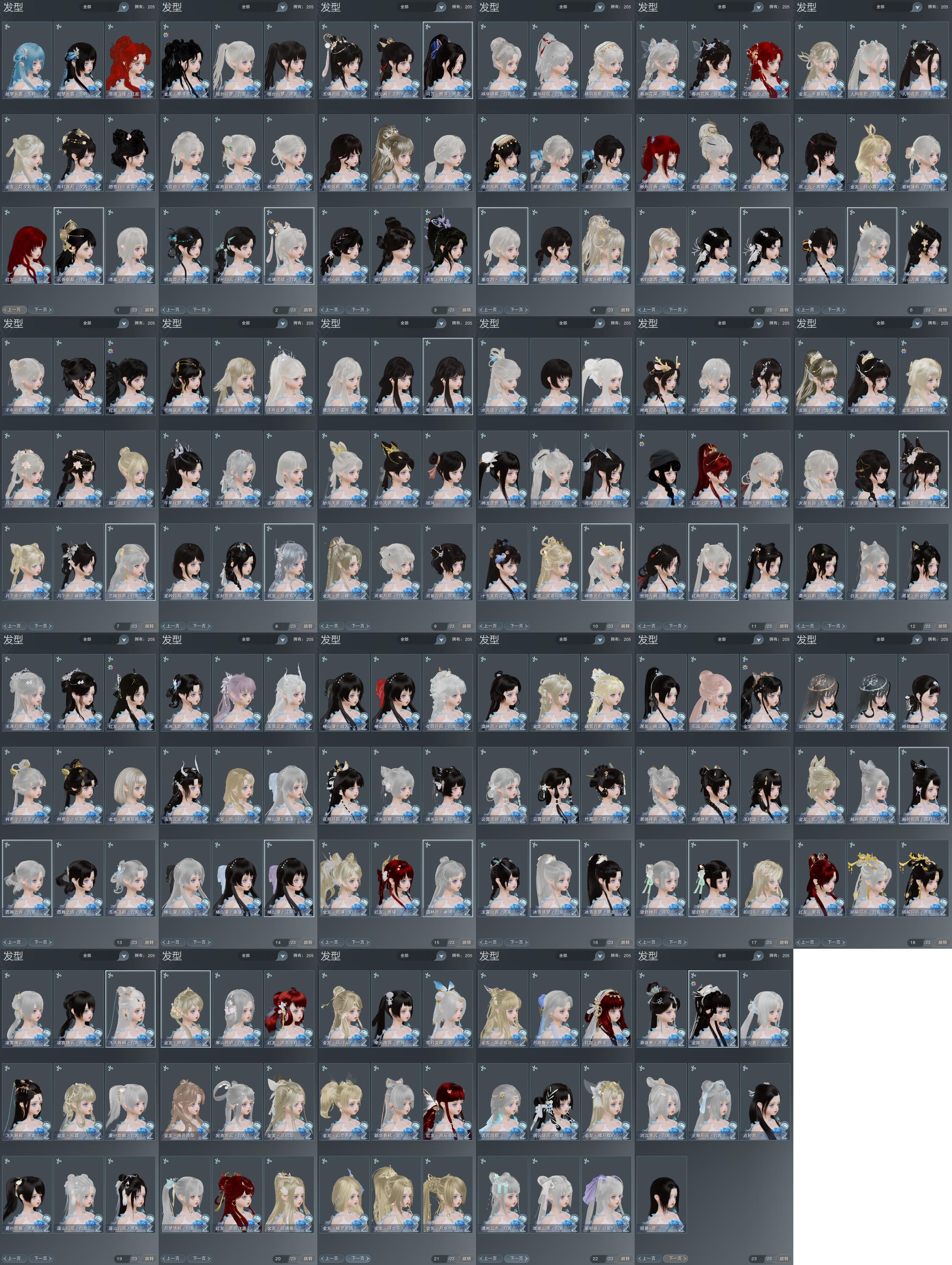 【发型】金发35个[一代金, 狐金, 兔金, 资历金, 中秋金, 鸡金, 蝶金, 喵金, 国金, 狗金, 龙女金, 玫瑰金, 猪金, 珊瑚金, 如归金, 云金, 雪金, 海金, 刺金, 蔷薇金, 水母金, 龙金, 三代金, 咩金, 铃金, 傲月金发, 精灵金, 蛇金, 翎金, 金发奉清茗, 马金, 绿幽昙金发, 绿龙隐金发, 金月下金发, 灰陇西金发], 红发18个[七红, 八红, 九红, 十红, 十四红, 蓝葵蓝发, 凤仙粉, 蝶粉, 兔红, 小资历红, 龙红, 十五红, 蛇红, 蓝寻香红发, 马红, 雪漠飞绫红发, 二代灰, 三代灰银], 黑发82个, 白发68个, 盒子发型[二代花朝黑, 一代蓝中秋白, 丝路黑, 一代七夕白, 二代七夕白, 踏云黑发, 飞天黑发, 四代七夕黑发, 四代中秋蓝黑发, 绿盒黑发, 二代重阳白, 三代中秋白, 雪月白发, 棉袄白, 二代花朝白, 丝路白, 踏云白发, 绿如归黑发, 飞天白发, 四代七夕白发, 四代中秋蓝白发, 绿中秋黑发, 墨心黑发, 净尘黑发, 绿中秋白发, 净尘白发, 花滑黑发, 花滑白发, 山海黑发, 竹露响霜色黑发, 雏菊黑发, 黑傣族黑发, 雏菊白发, 蓝钻石盒黑发, 黑傣族白发, 红椿山黑发, 黑椿山黑发, 紫椿山黑发, 蓝椿山黑发, 踏青黑发, 蓝钻石盒白发, 灵龙盒黑发, 蓝兔盒黑发, 圆舞盒黑发, 黑椿山白发, 蓝椿山白发, 踏青白发, 白持君盒黑发, 灵龙白发, 蓝兔盒白发, 八七盒黑发, 圆舞盒白发, 白幽馥黑发, 白持君盒白发, 天星盒黑发, 八七盒白发, 绿龙隐黑发, 红香盒黑发, 游龙盒黑发, 婚纱盒黑发, 天星盒白发, 粉鹿黑发, 蓝观灯盒黑发, 红香盒白发, 海阔盒黑发, 游龙盒白发, 熊猫黑发, 茄盒黑发, 妙乐盒黑发, 白鹭黑发, 婚纱盒白发, 粉鹿白发, 黑鹭黑发, 龙吟盒黑发, 梦盒黑发, 兰陵盒黑发, 海阔盒白发, 熊猫白发, 黑月下黑发, 茄盒白发, 妙乐盒白发, 九七黑发, 白鹭白发, 白蛇盒黑发, 柿盒黑发, 龙吟盒白发, 红上火黑发, 梦盒白发, 兰陵盒白发, 人间夜色黑发, 九七白发, 柿盒白发, 白蛇盒白发, 白陇西黑发, 灰陇西黑发, 人间夜色白发, 墨龙盒黑发, 蓝蝴蝶黑发, 墨龙盒白发, 重花游黑发, 潮涌盒黑发, 蓝蝴蝶白发, 络羽黑发, 云间盒黑发, 傀儡黑发, 重花游白发, 蓝问刀黑发, 潮涌盒白发, 络羽白发, 云间盒白发, 白战国黑发, 玉璃盒黑发, 绿浮光黑发, 瑶台仙梦黑发, 玉璃盒白发, 瑶台仙梦白发, 黄云香黑发, 粉毛衣黑发, 华灯夕雪黑发, 蓝葵黑发], 总页数23