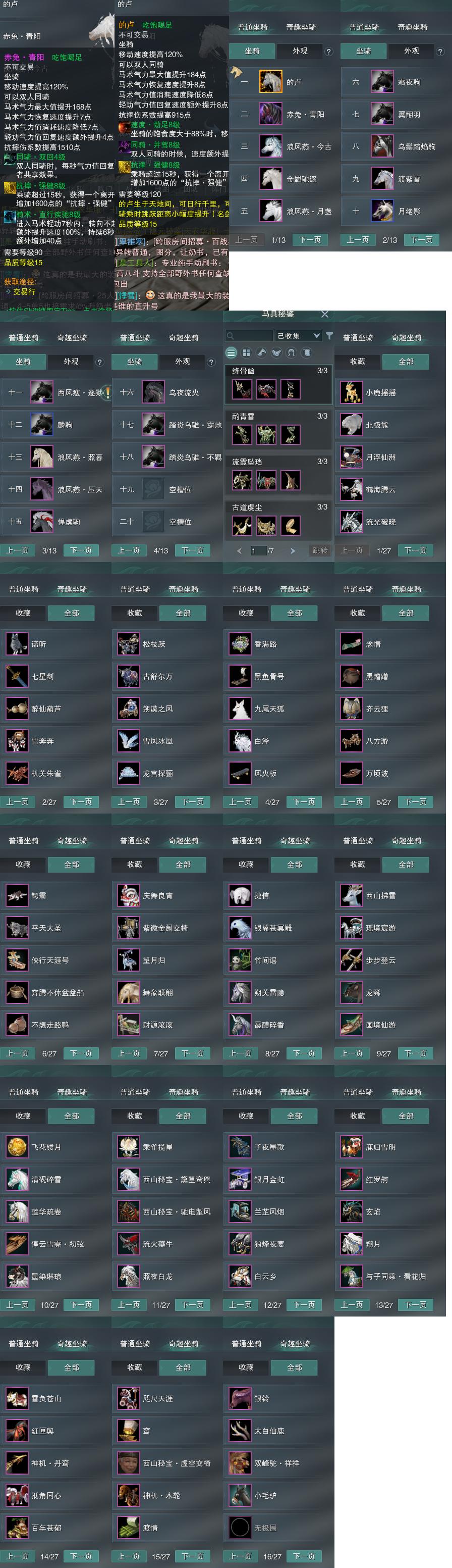 【坐骑】18个[的卢, 踏炎不羁, 踏炎霸地, 西风瘦逐狱, 赤兔青阳, 金羁驰逐, 浪风燕今古, 乌鬃踏焰驹]