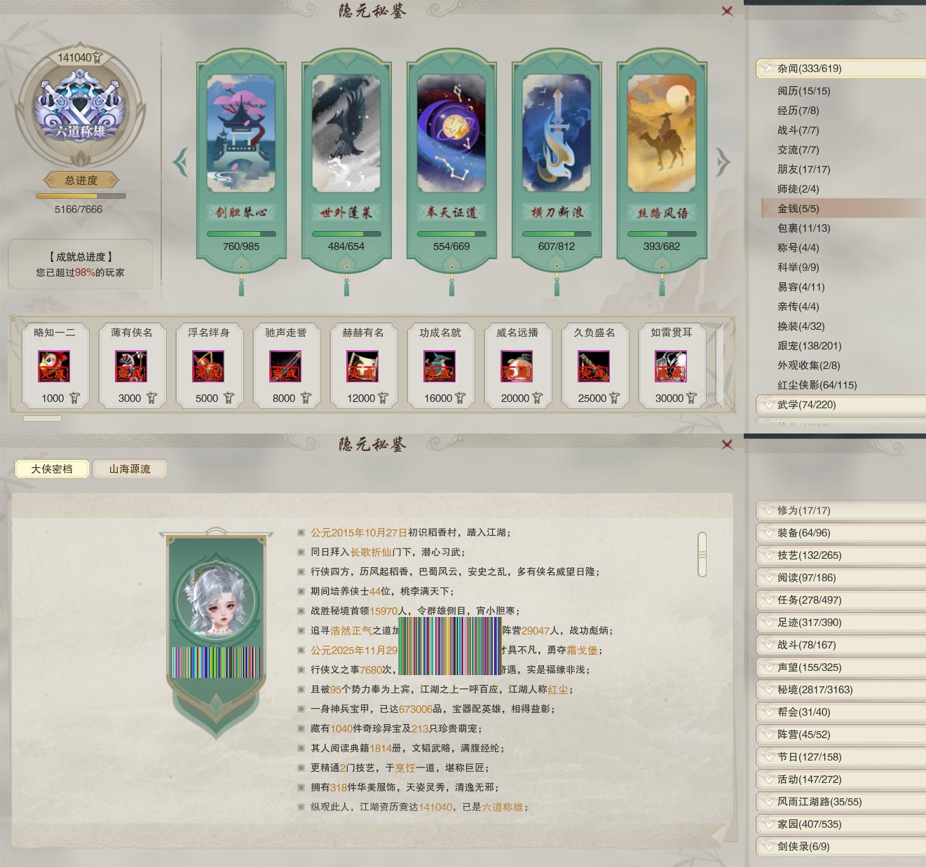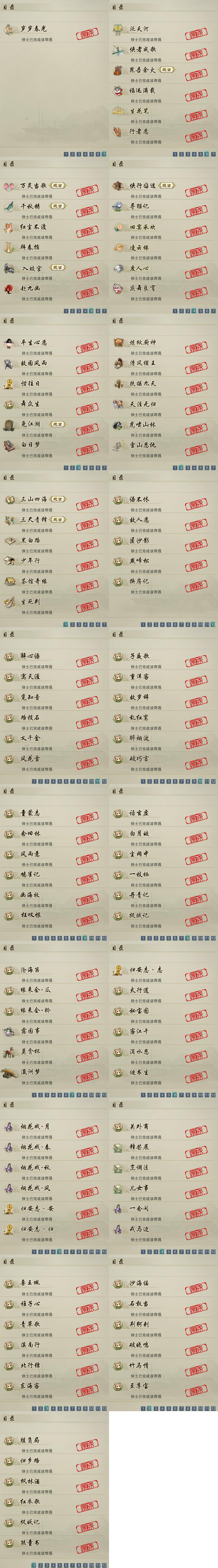 【奇遇】37个[白日梦, 天涯无归, 三山四海, 雪山恩仇, 平生心愿, 兔江湖, 黑白路, 惜往日, 虎啸山林, 少年行, 故园风雨, 扶摇九天, 三尺青锋, 舞众生, 清风捕王, 侠行囧途, 寻猫记, 茶馆奇缘, 万灵当歌, 入蛟宫, 庆舞良宵, 生死判, 千秋铸, 凌云梯, 炼狱厨神, 赴九幽, 度人心, 旧宴承欢, 泛天河, 昆吾余火]