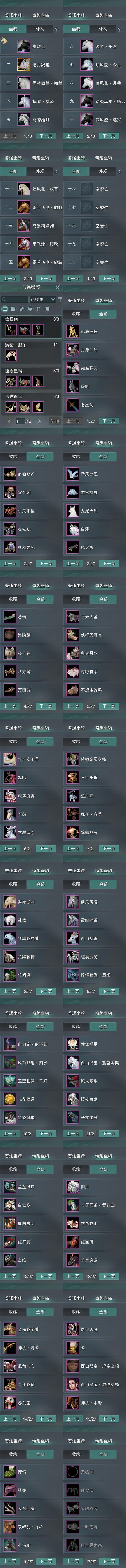 【坐骑】15个[踏炎腾云, 西风瘦逐狱, 阵营白狼, 乌蹄抱月, 里飞沙踏秋, 白川普马, 挥戈飒沓, 浪风燕今古, 骁将千龙, 霸红尘, 雷首飞电驰辉, 雷首飞电逾虹, 乌鬃踏焰驹]