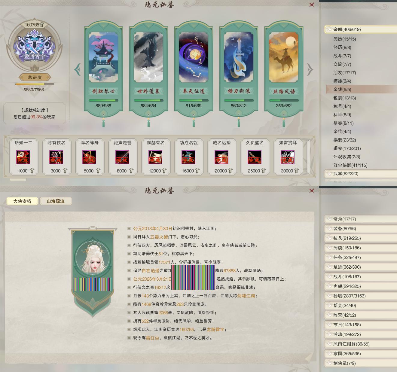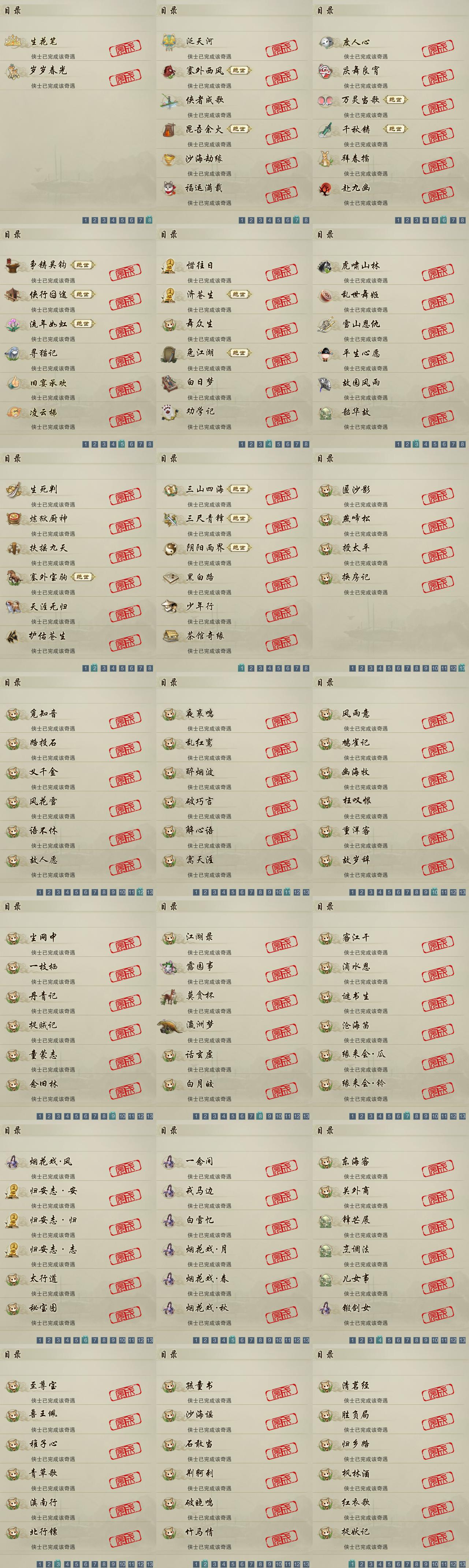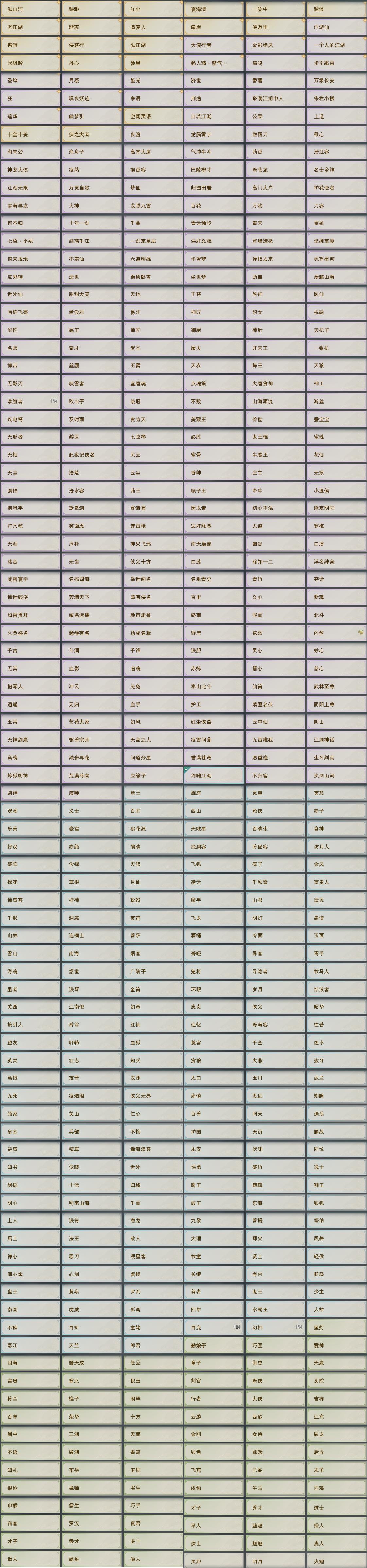 【奇遇】44个[白日梦, 天涯无归, 三山四海, 劝学记, 雪山恩仇, 阴阳两界, 兔江湖, 平生心愿, 黑白路, 惜往日, 乱世舞姬, 塞外宝驹, 争铸吴钩, 虎啸山林, 韶华故, 济苍生, 护佑苍生, 少年行, 故园风雨, 扶摇九天, 三尺青锋, 流年如虹, 舞众生, 侠行囧途, 寻猫记, 茶馆奇缘, 庆舞良宵, 万灵当歌, 生死判, 千秋铸]
