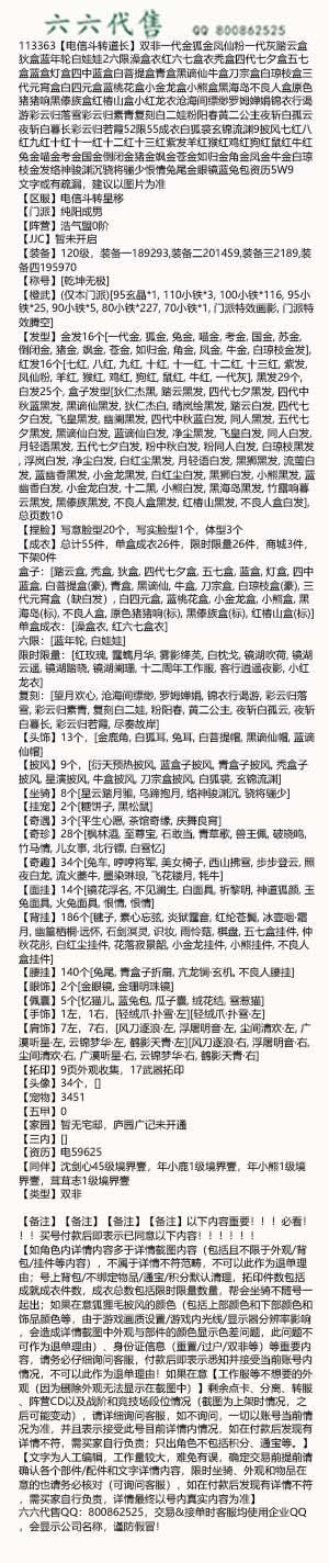 【如角色内详情内容多于详情截图内容(包括且不限于外观/背包/挂件等内容),不属于详情不符范畴,不可以此作为退单理由;号上背包/不绑定物品/通宝/积分默认清理,拓印件数包括成就成衣件数,成衣总数包括限时限量数量,帮会坐骑不随号一起出;如果在意狐狸毛披风的颜色(包括上部颜色和下部颜色和饰品颜色等,由于游戏画质设置/游戏内光线/显示器分辨率影响,会造成详情截图中外观与部件的颜色显示色差问题,此问题不可作为退单理由)、身份证信息(重置/过户/双非等)等重要内容,请务必仔细询问客服,付款后即表示悉知并接受当前账号内情况,不可以此作为退单理由!如果在意【工作服等不想要的外观(因为删除外观无法显示在截图中)】剩余点卡、分离、转服、阵营CD以及战阶和竞技场段位情况(截图为上架时情况,之后可能变动),请详细询问客服,如不询问,一切以账号当前情况为准,并且表示接受此号目前详情内情况,如在付款后发现有详情不符,需买家自行负责;只出角色不包括积分、通宝等。】
