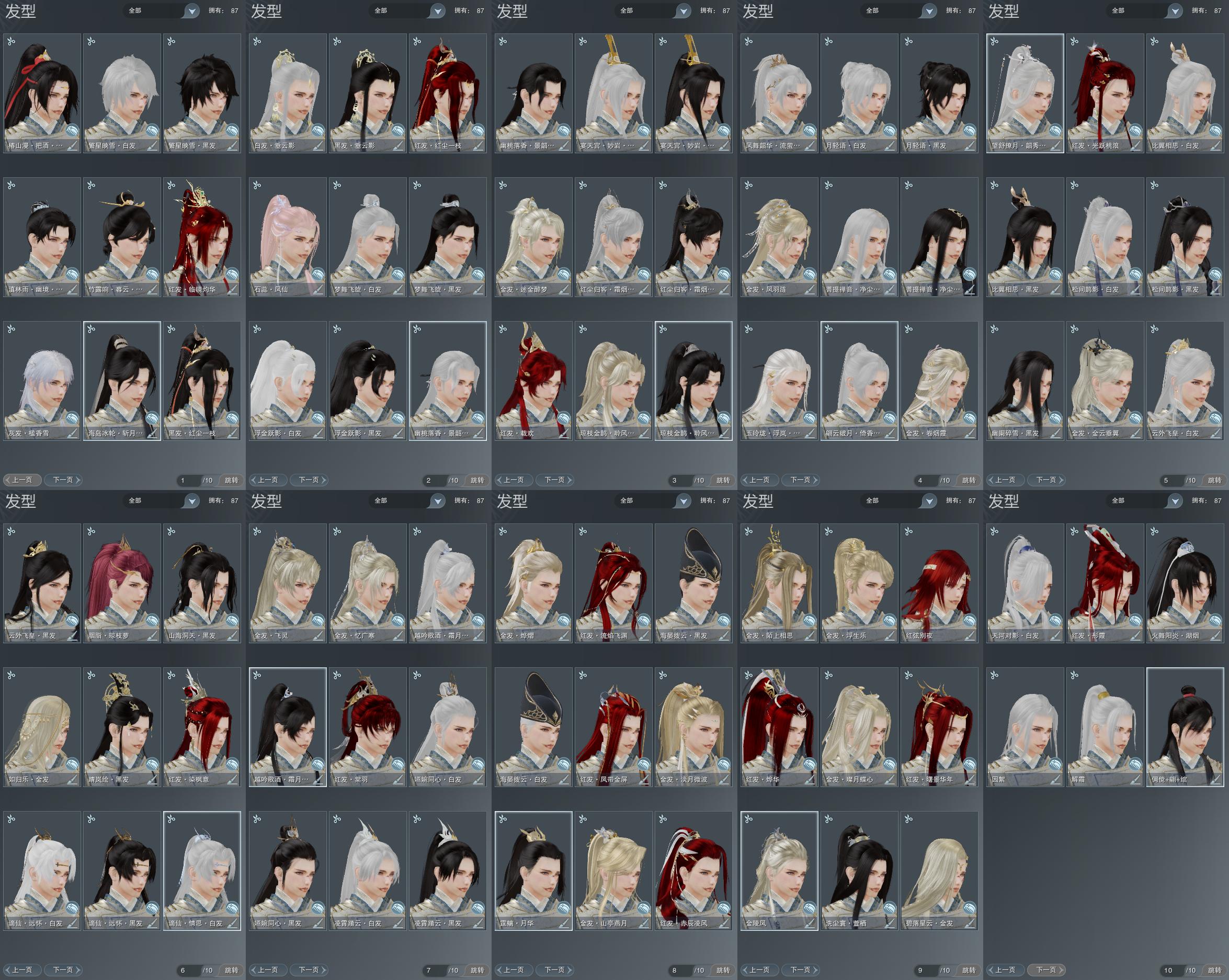 【发型】金发16个[一代金, 狐金, 兔金, 喵金, 考金, 国金, 苏金, 倒闭金, 猪金, 飒金, 苍金, 如归金, 角金, 凤金, 牛金, 白琼枝金发], 红发16个[七红, 八红, 九红, 十红, 十一红, 十二红, 十三红, 紫发, 凤仙粉, 羊红, 猴红, 鸡红, 狗红, 鼠红, 牛红, 一代灰], 黑发29个, 白发25个, 盒子发型[狄仁杰黑, 踏云黑发, 四代七夕黑发, 四代中秋蓝黑发, 黑谪仙黑发, 狄仁杰白, 晴岚绘黑发, 踏云白发, 四代七夕白发, 飞皇黑发, 幽阑黑发, 四代中秋蓝白发, 同人黑发, 五代七夕黑发, 黑谪仙白发, 蓝谪仙白发, 净尘黑发, 飞皇白发, 同人白发, 月轻语黑发, 五代七夕白发, 粉中秋白发, 粉同人白发, 白琼枝黑发, 浮岚白发, 净尘白发, 白红尘黑发, 月轻语白发, 黑狮黑发, 流萤白发, 蓝幽香黑发, 小金龙黑发, 白红尘白发, 黑狮白发, 小熊黑发, 蓝幽香白发, 小金龙白发, 十二黑, 小熊白发, 黑海岛黑发, 竹露响暮云黑发, 黑傣族黑发, 不良人盒黑发, 红椿山黑发, 不良人盒白发], 总页数10