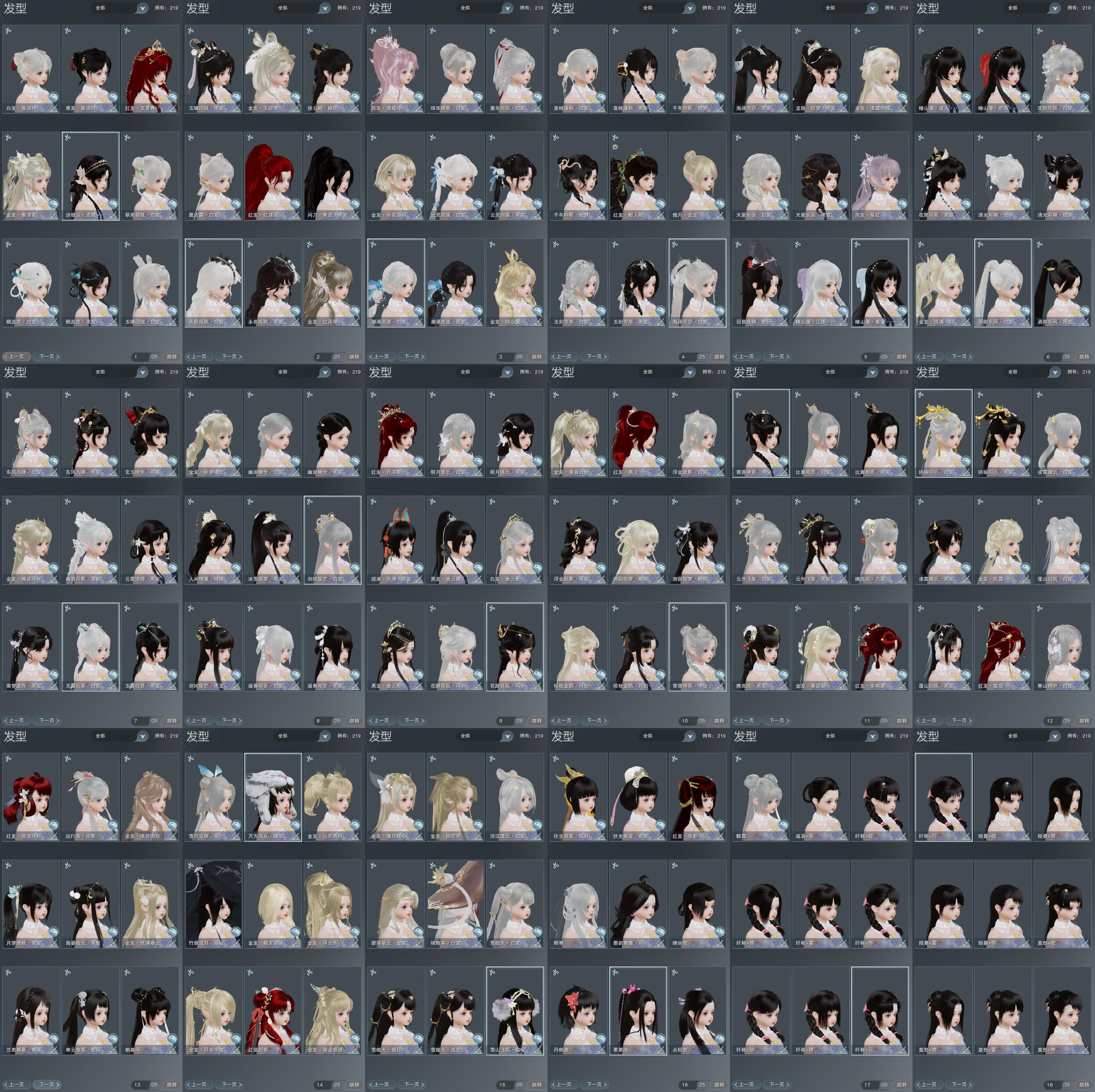 【发型】金发25个[狐金, 猴金, 资历金, 鼠金, 鸡金, 蝶金, 喵金, 国金, 苏金, 龙女金, 玫瑰金, 珊瑚金, 云金, 女仆金, 雪金, 海金, 水母金, 铃金, 傲月金发, 永夜金, 翎金, 七中金发, 金发奉清茗, 澄琼枝金发, 蓝游园金发], 红发12个[五红, 蝶粉, 鸡红, 猪红, 鼠红, 虎红, 小资历红, 大资历红, 十五红, 十六红, 马红, 二代灰], 黑发63个, 白发44个, 盒子发型[二代花朝黑, 狄仁杰黑, 踏云黑发, 四代七夕黑发, 晴岚绘黑发, 雪月白发, 棉袄白, 红腿白, 二代花朝白, 踏云白发, 四代七夕白发, 飞皇黑发, 五代七夕黑发, 晴岚绘白发, 净尘黑发, 飞皇白发, 五代七夕白发, 澄琼枝黑发, 净尘白发, 蓝游园黑发, 小金龙黑发, 小金龙白发, 红六七黑发, 红六七白发, 红懒猪黑发, 蝴蝶黑发, 红梅盒黑发, 花滑黑发, 星源黑发, 蝴蝶白发, 紫人间黑发, 红梅盒白发, 星源白发, 山海黑发, 山海白发, 乘梦虚舟黑发, 雏菊黑发, 红玄玉黑发, 幽涧愀兮白发, 绿幽昙白发, 除夕盒黑发, 卿酒盒黑发, 蓝钻石盒黑发, 红椿山黑发, 黑椿山黑发, 蓝椿山黑发, 踏青黑发, 除夕盒白发, 红黑妖眸盒黑发, 卿酒盒白发, 蓝钻石盒白发, 紫椿山白发, 踏青白发, 天星盒黑发, 白龙隐黑发, 天星盒白发, 海阔盒黑发, 海阔盒白发, 白蛇盒黑发, 柿盒黑发, 柿盒白发, 白蛇盒白发, 仙剑黑发, 潮涌盒黑发, 傀儡黑发, 仙剑白发, 潮涌盒白发, 黄问刀黑发, 傀儡白发, 红战国黑发, 玉璃盒黑发, 玉璃盒白发, 涉烟尘流徵黑发], 总页数18
