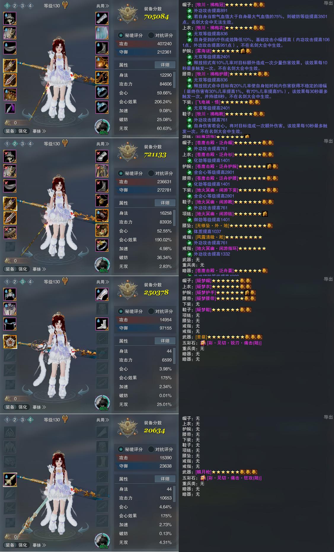 【装备】130级,山居剑意/问水诀PVE705084,山居剑意/问水诀PVP721133,装备三250378,装备四20634