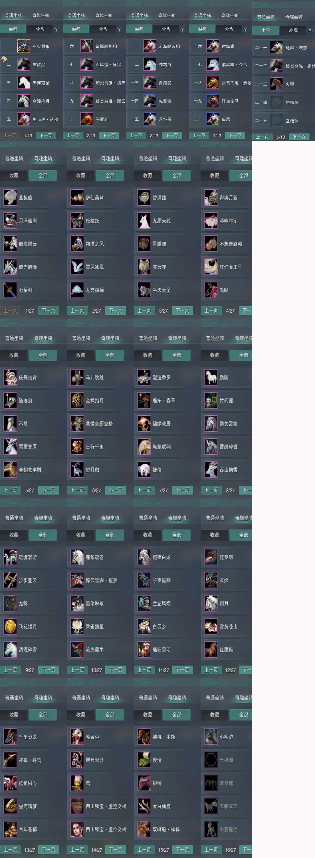 【坐骑】23个[踏炎横天, 踏炎腾云, 踏炎霸地, 西风瘦逐狱, 阵营狼, 乌蹄抱月, 里飞沙踏秋, 小樱马, 浪风燕今古, 霸红尘, 雷首飞电步景, 乌鬃踏焰驹]