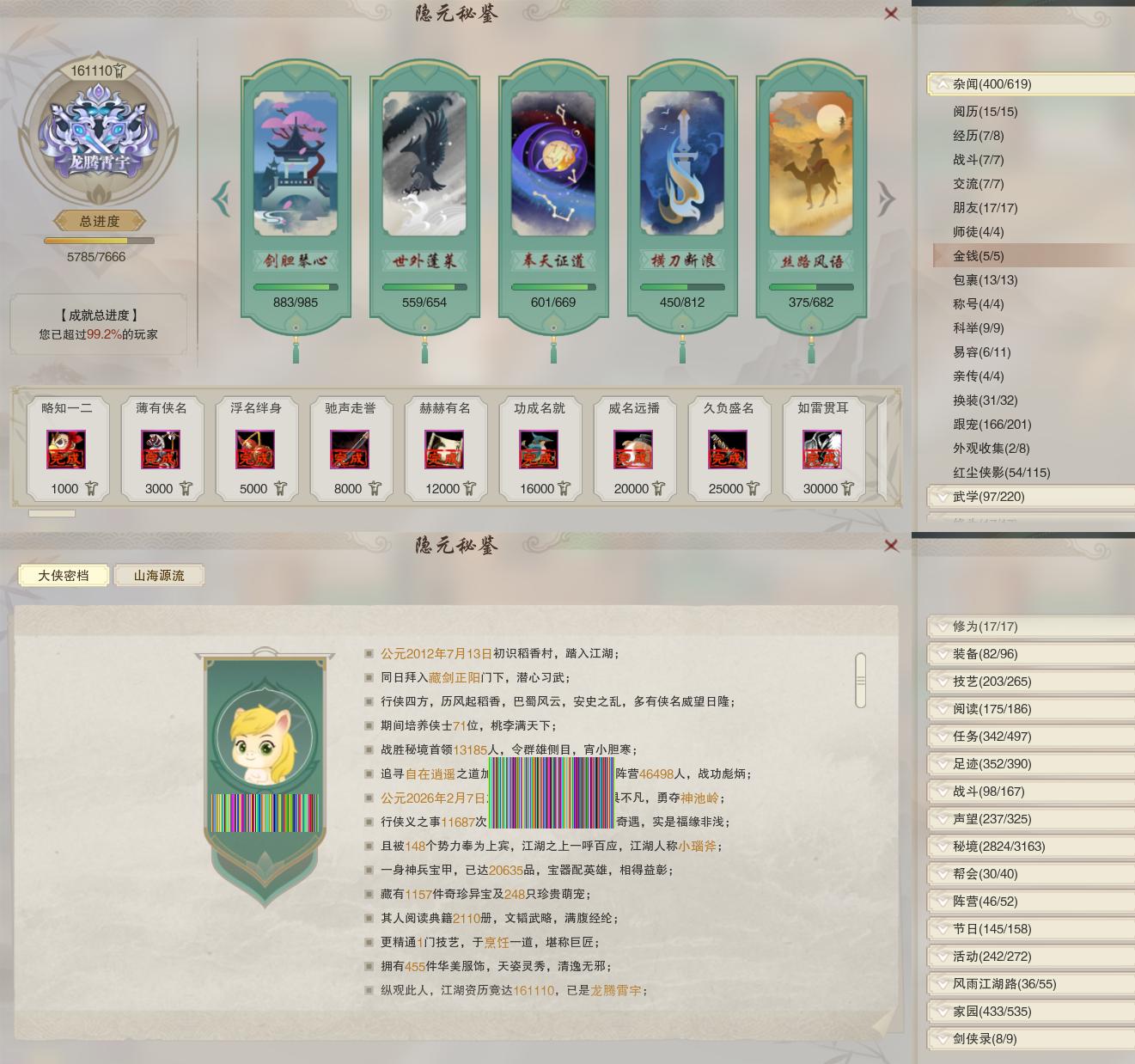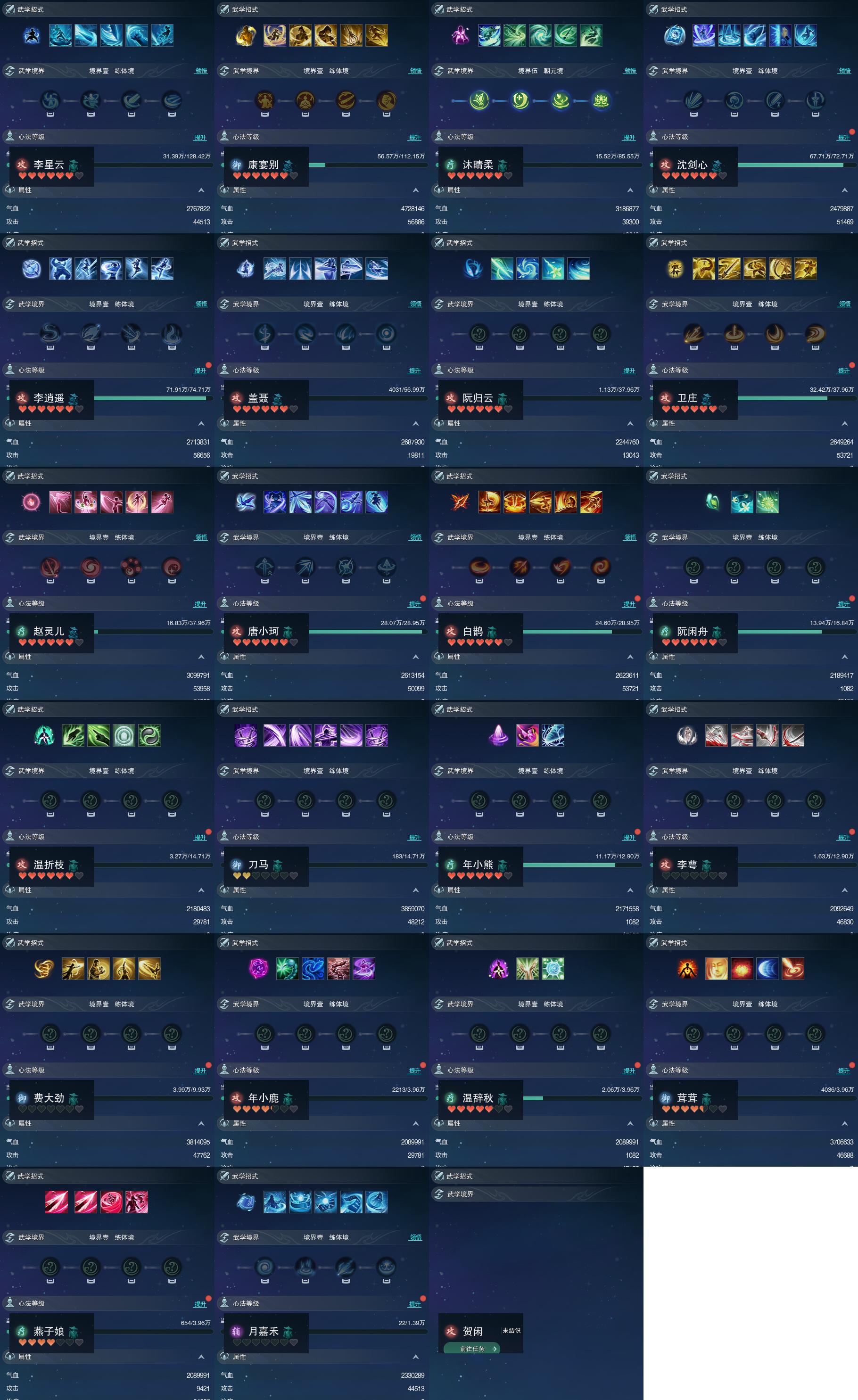 【同伴】李星云86级境界壹,康宴别85级境界壹,沐晴柔83级境界伍,沈剑心83级境界壹,李逍遥82级境界壹,盖聂80级境界壹,阮归云77级境界壹,卫庄意77级境界壹,赵灵儿77级境界壹,唐小珂75级境界壹,白鹊志75级境界壹,阮闲舟71级境界壹,温折枝70级境界壹,刀马志70级境界壹,年小熊69级境界壹,李萼志69级境界壹,费大劲67级境界壹,年小鹿60级境界壹,温辞秋60级境界壹,茸茸志60级境界壹,燕子娘60级境界壹,月嘉禾52级境界壹,贺闲级