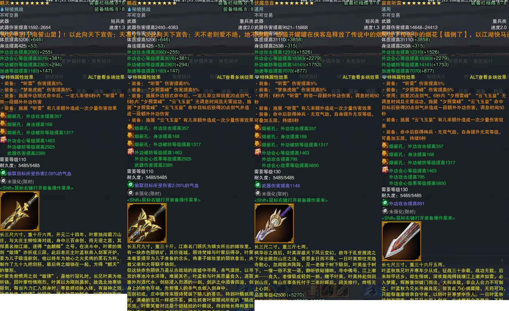 【橙武】(仅本门派)[130CW伏魔悲音, 130CW寂夜听雷, 120小铁*138, 130小铁*284, 十六W奇遇书*1, 110玄晶*1, 95玄晶*1, 70玄晶*1, 110小铁*308, 100小铁*173, 95小铁*254, 90小铁*349, 80小铁*354, 70小铁*341, 110CW麒天, 110CW麟战, 90CW泰阿, 90CW千叶长生, 门派特效岚尘金蛇]