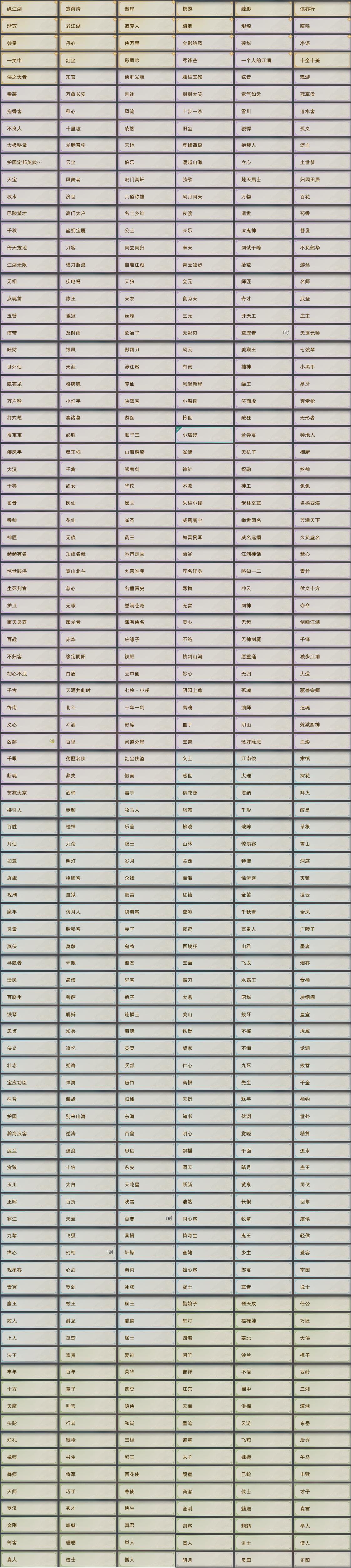 【奇遇】41个[白日梦, 天涯无归, 三山四海, 劝学记, 雪山恩仇, 阴阳两界, 莫负初心, 兔江湖, 平生心愿, 黑白路, 惜往日, 乱世舞姬, 塞外宝驹, 争铸吴钩, 韶华故, 虎啸山林, 济苍生, 护佑苍生, 少年行, 故园风雨, 扶摇九天, 三尺青锋, 流年如虹, 舞众生, 清风捕王, 侠行囧途, 寻猫记, 茶馆奇缘, 庆舞良宵, 生死判]