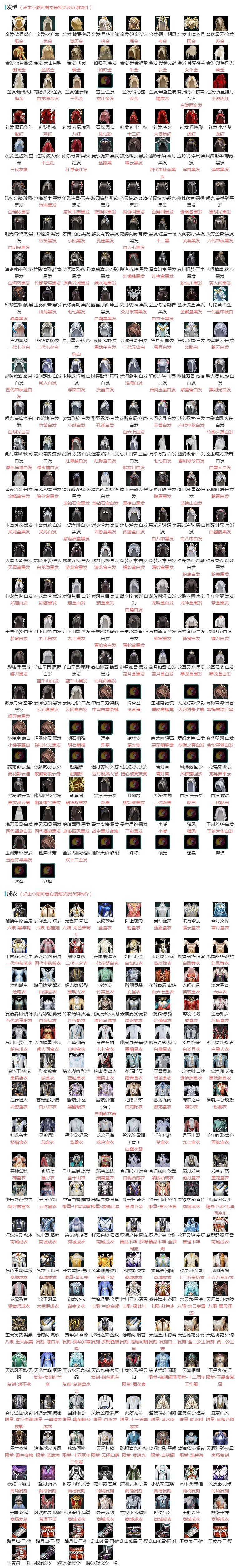 单盒成衣:[雪月盒衣, 红凤舞衣, 五代紫重阳衣, 红竹影衣, 紫人间盒衣, 山神盒衣, 黑幽昙衣, 黑傣族衣, 黑沧洲盒衣, 黑幽馥衣, 白幽馥衣替, 蓝鹭衣, 白鹭衣替, 瑞雪盒衣, 紫陇西成衣]