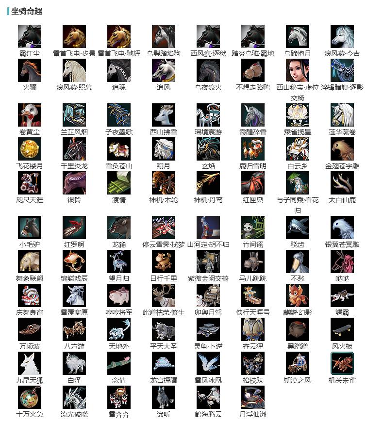 【坐骑】8个[踏炎霸地, 西风瘦逐狱, 乌蹄抱月, 浪风燕今古, 霸红尘, 雷首飞电步景, 雷首飞电驰辉, 乌鬃踏焰驹]